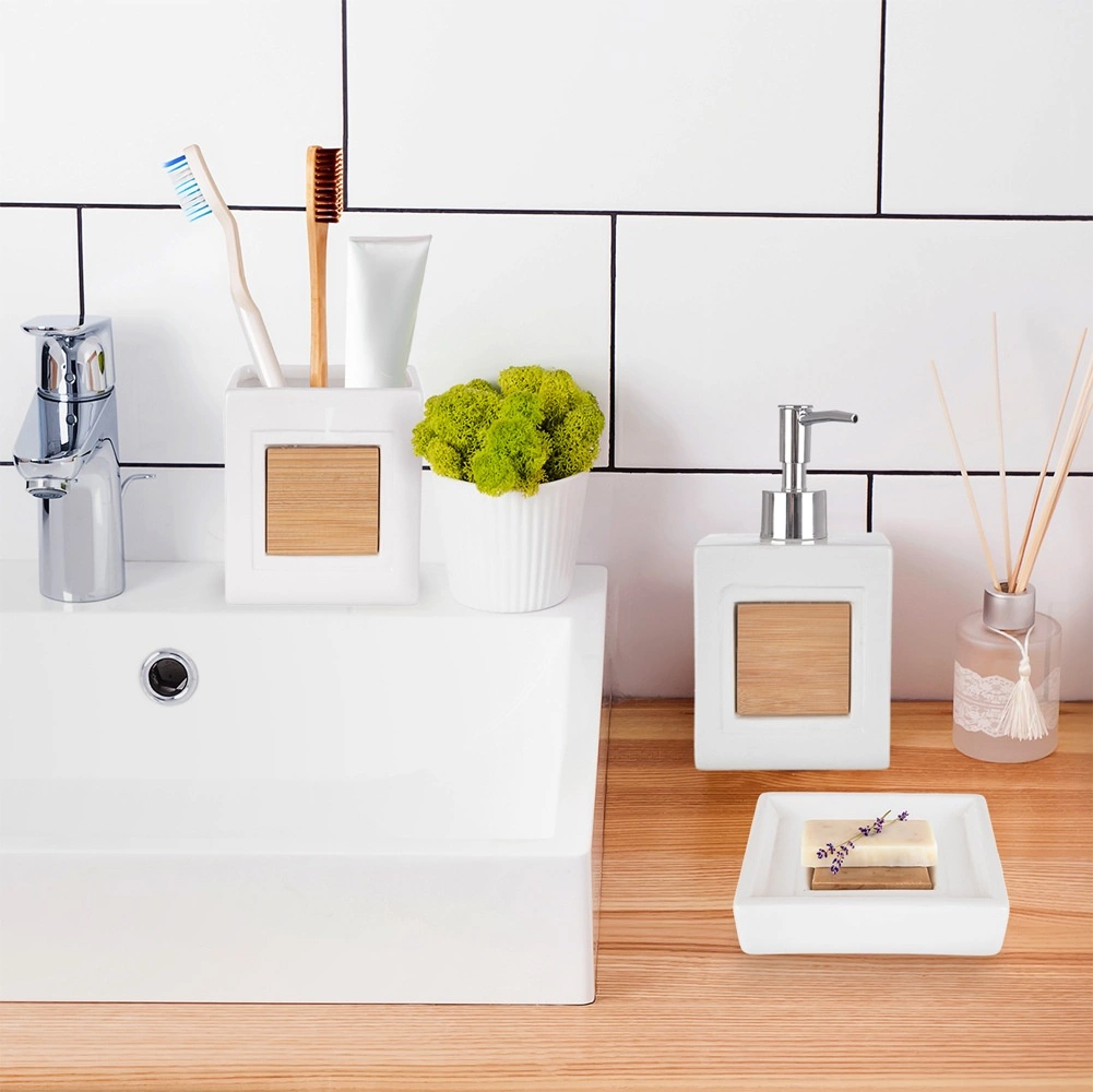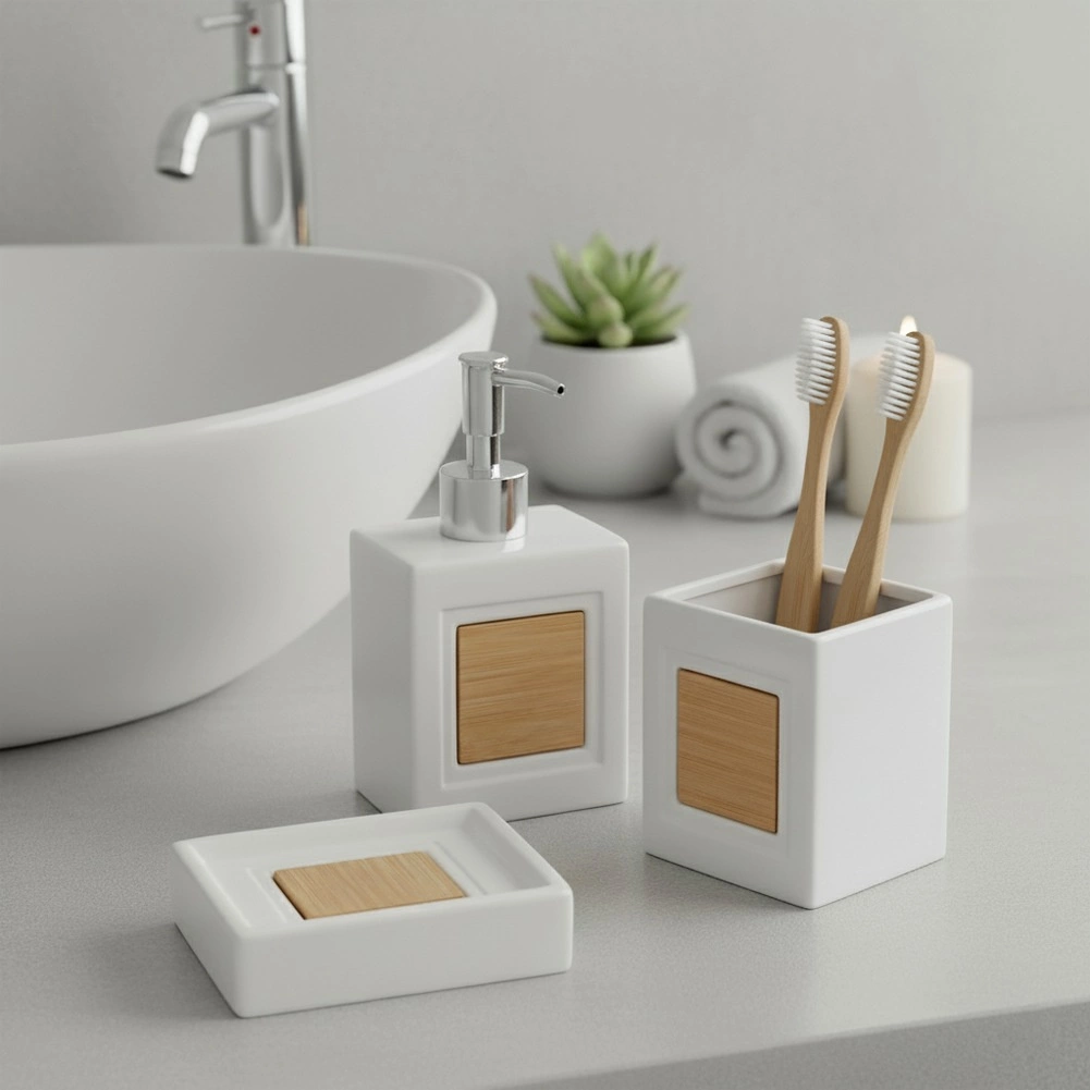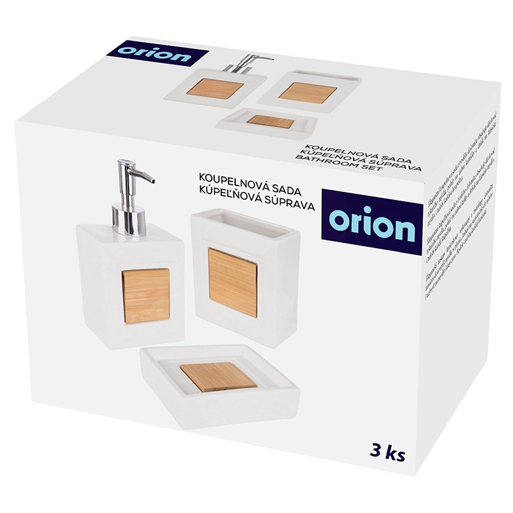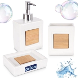 Komplektā ietilpst šķidro ziepju dozators ar precīzu dozēšanu, krūzīte zobu birstēm vai kosmētikas piederumiem un ziepju trauciņš higiēniskai cieto ziepju novietošanai. Ideāli piemērots vannasistabai un tualetei – palīdz uzturēt kārtību un elegantu izskatu.