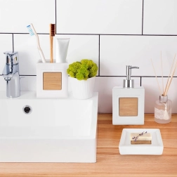 Balto dolomīta krūzīti ar dabīga bambusa akcentu ir viegli saskaņot gan ar modernu, gan klasisku vannas istabu.