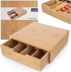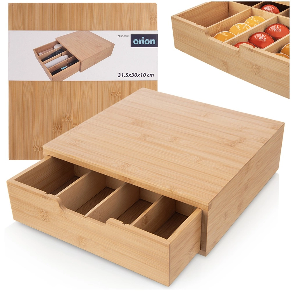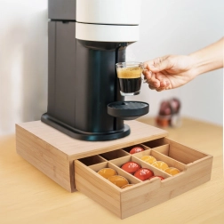 Praktisks bambusa organizators ar izvelkamu atvilktni un izņemamām starpsienām uztur kārtību kafijas kapsulām, tējas maisiņiem un nelieliem virtuves piederumiem. Pateicoties izturīgajai konstrukcijai, var kalpot arī kā paliktnis kafijas automātam un piedāvā universālu izmantojumu virtuvē, birojā un vannasistabā.