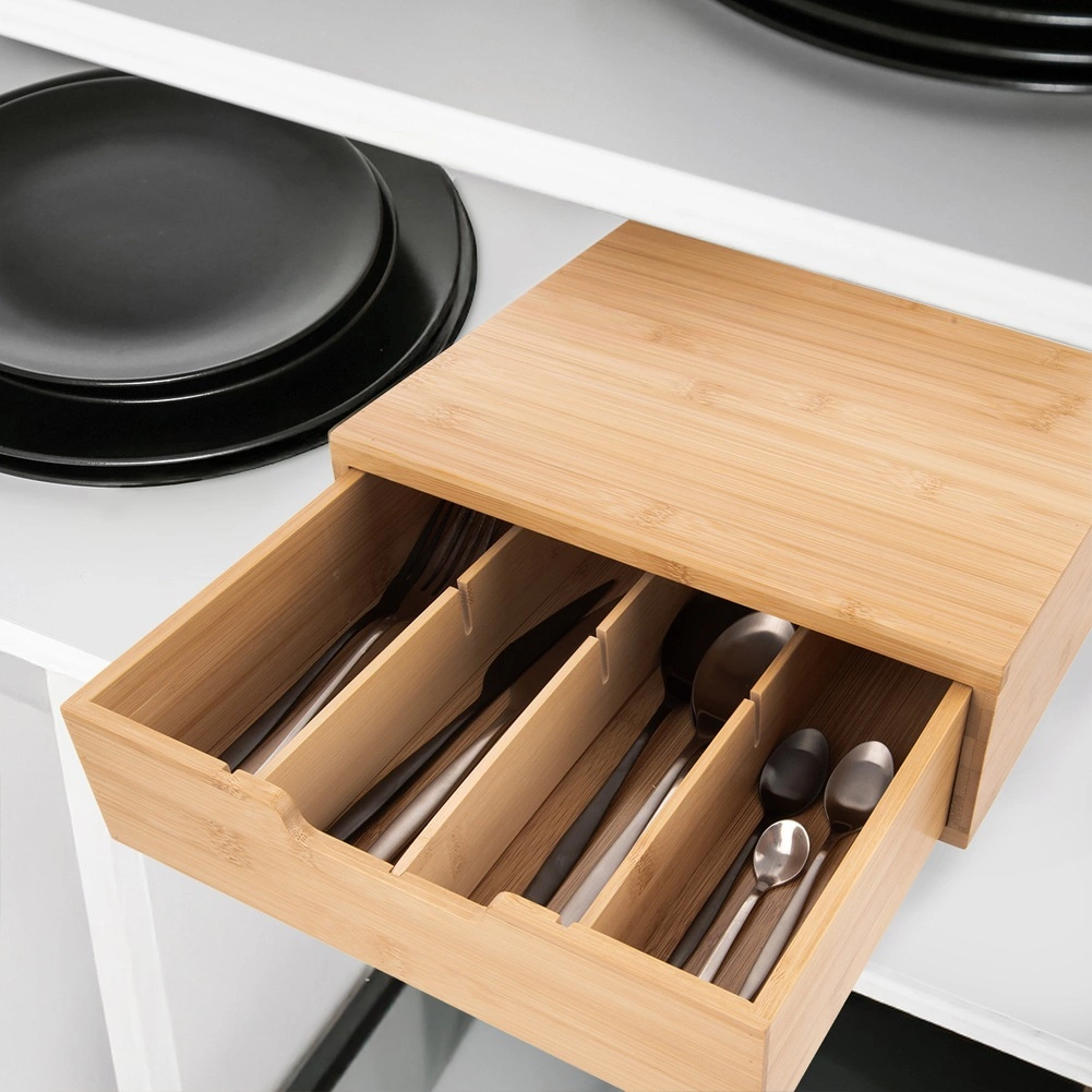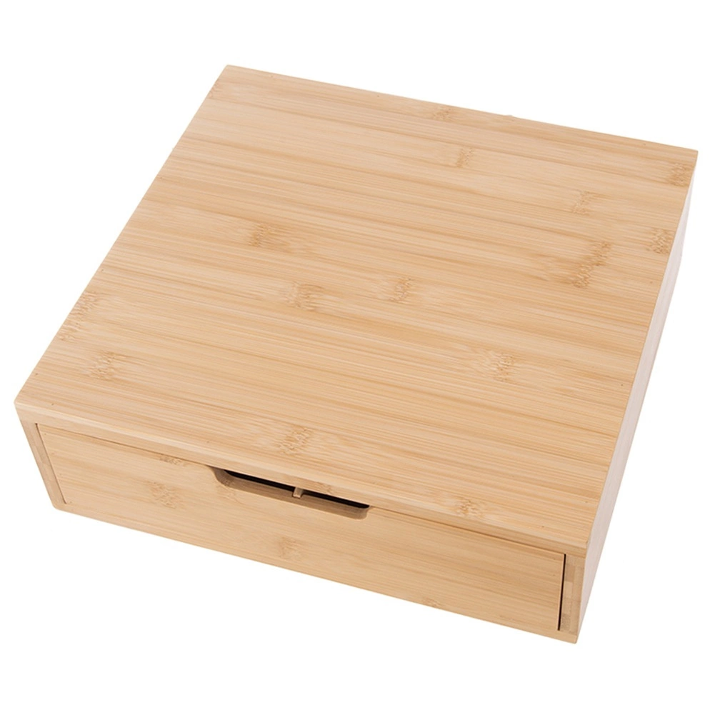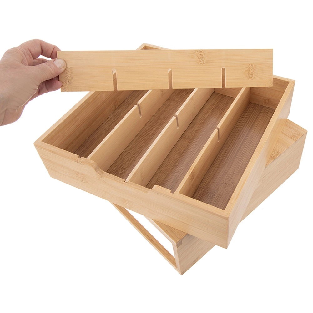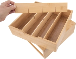 Elegants organizators no dabīga bambusa apvieno stilīgu izskatu un funkcionālu kārtošanu. Atvilktne ar starpsienām ļauj pārskatāmi šķirot kapsulas, tējas maisiņus, garšvielas un citas sīkas lietas. Pielāgojiet iekšējo dalījumu ar izņemamu elementu palīdzību tieši savām vajadzībām.