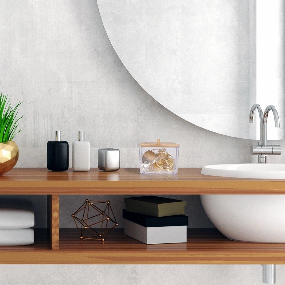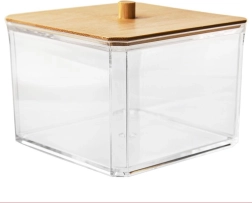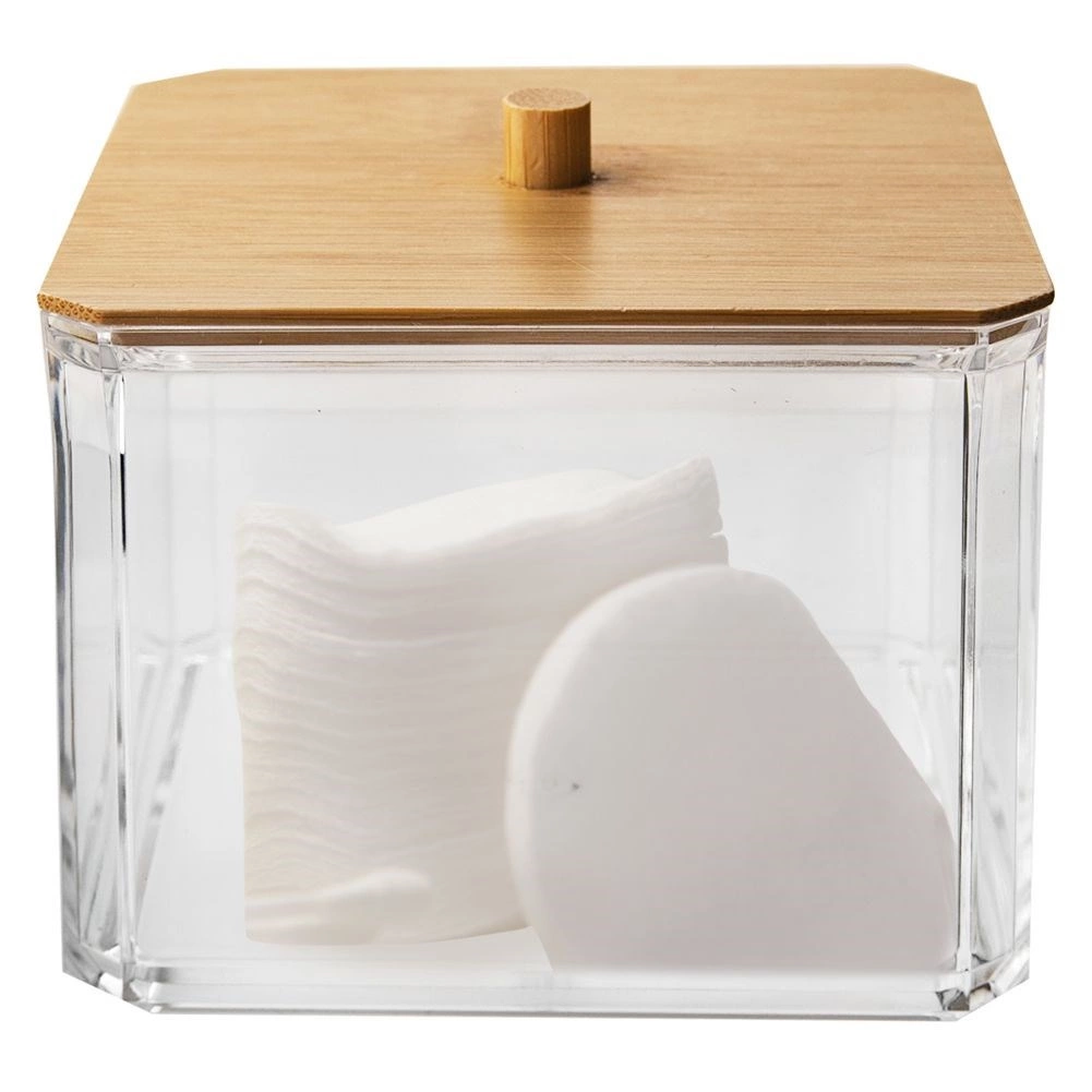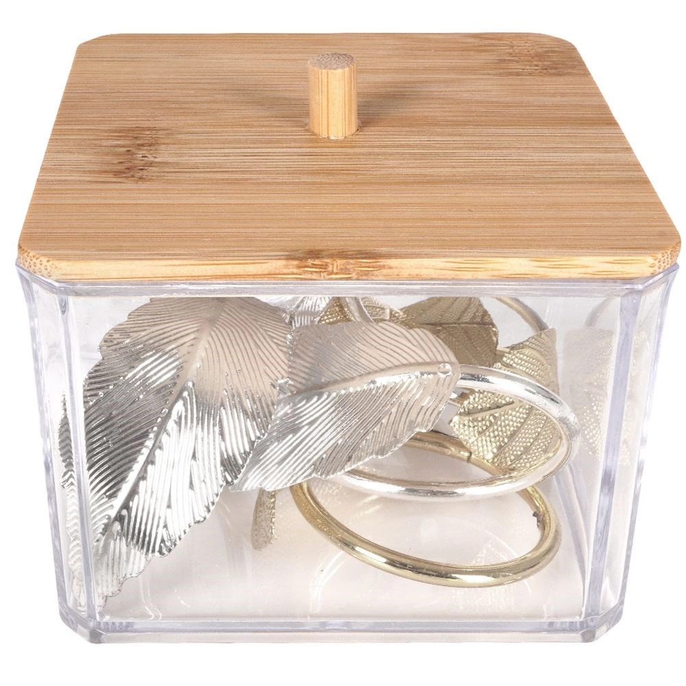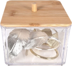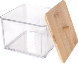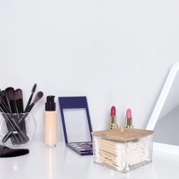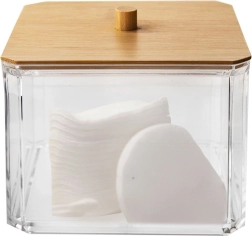 Praktisks un stilīgs organizators vates kociņiem no caurspīdīgas plastmasas ar dabīga bambusa vāciņu un rokturi. Uztur saturu tīru, vienmēr pa rokai un lieliski iederas jebkurā vannas istabā vai uz tualetes galdiņa. Pateicoties caurspīdīgajām sienām, jūs uzreiz redzat krājumus, bet papildināšana, izmantojot augšējo atveri, ir īpaši vienkārša. Izturīgs izpildījums, bambusa vāciņš pret putekļiem un mūsdienīgs dizains ikdienas ērtībām.