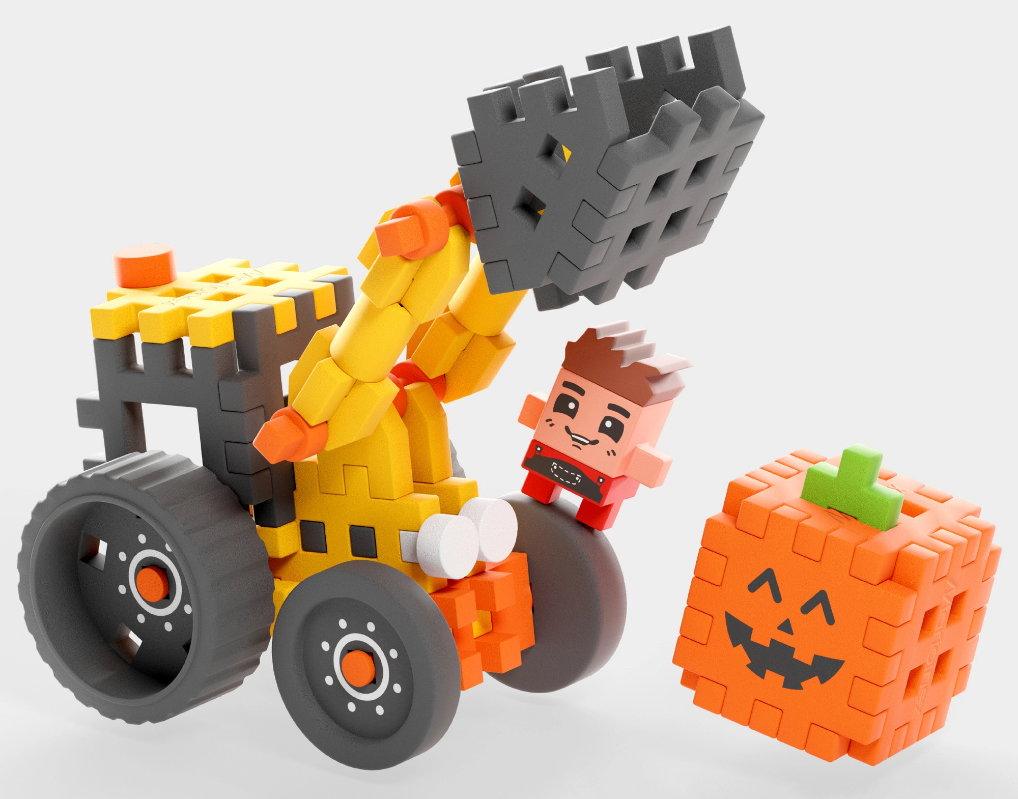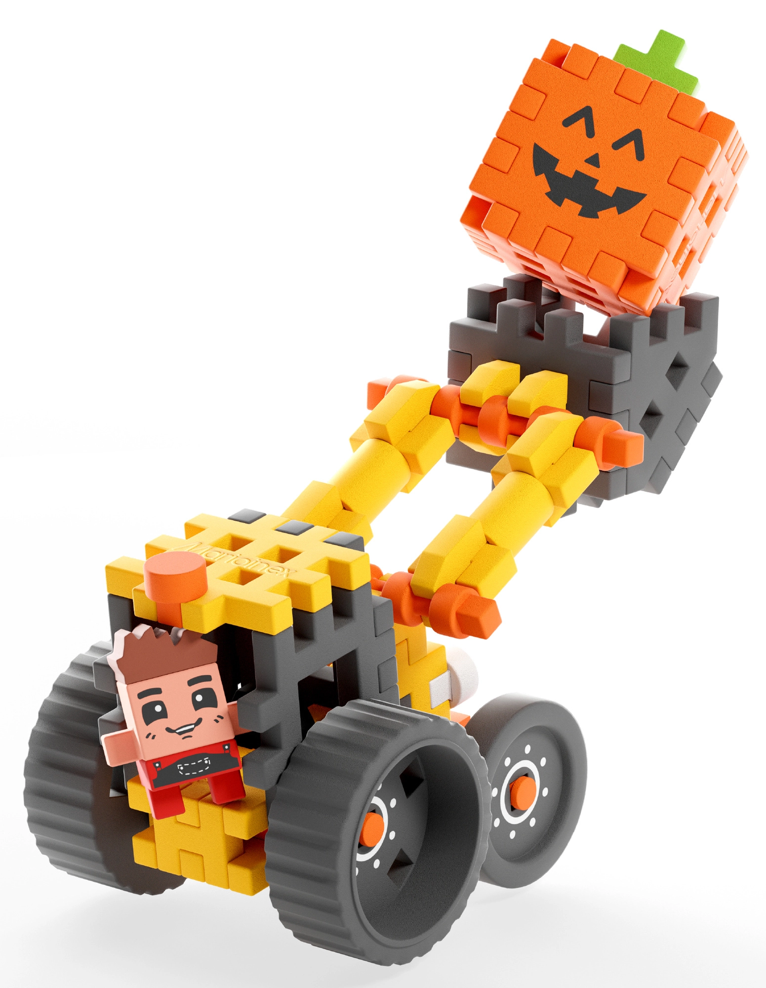 Uzbūvējiet reālistisku frontālo iekrāvēju un dodieties saimniecības piedzīvojumos kopā ar Fredija figūriņu. Pateicoties elastīgajām Mini Waffle detaļām, konstrukciju ir viegli salikt un izjaukt, ļaujot bērniem atkal un atkal būvēt, pielāgot un izdomāt jaunus stāstus. Kustīgā strēle un robustie riteņi nodrošina daudz darbības un jautrības, pārvietojot “ķirbjus” un sakopjot sētu.