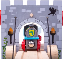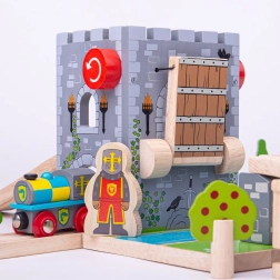 Izveidojiet uz trases viduslaiku cietoksni! BIGJIGS RAIL koka paceļamais tilts ar funkcionālu vinču ļauj bērniem pacelt tiltu, apturēt vilcieniņu un inscenēt bruņinieku piedzīvojumus. Reālistiskas akmens mūra faktūras, ģerboņi, lāpas un tilts pār “ūdens” grāvi rosina iztēli un tematisko spēli.