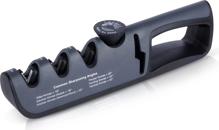Pagriežams rullītis ļauj iestatīt ideālu leņķi virtuves nažiem (14–20°), EDC un salokāmajiem nažiem (20–22°) vai robustākiem āra un medību asmeņiem (22–24°).