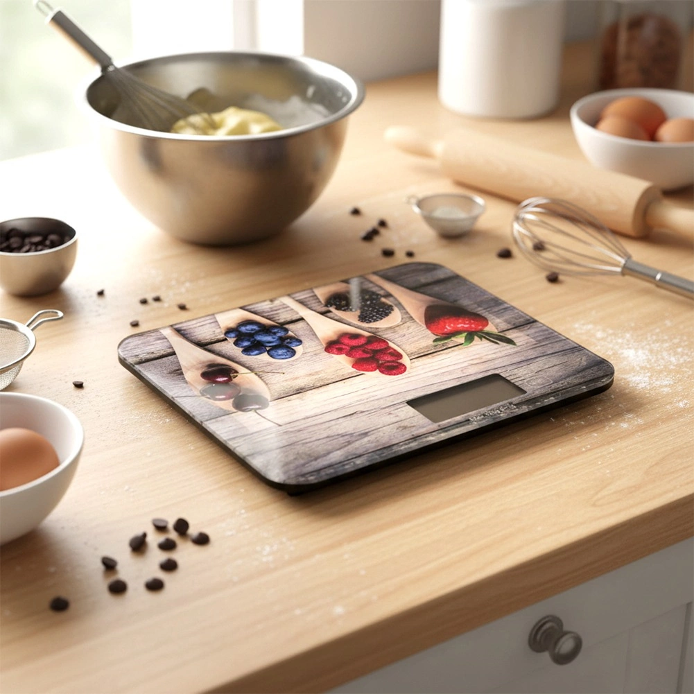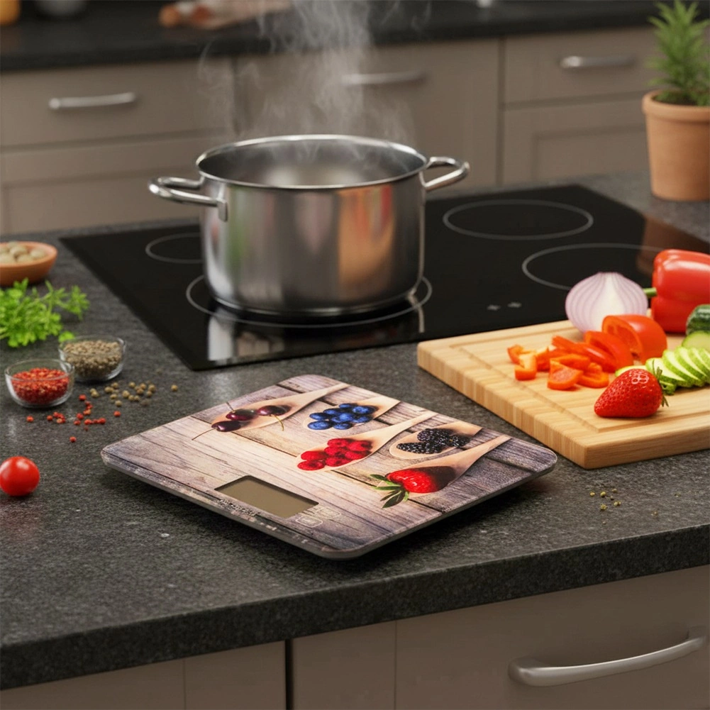 Šie digitālie virtuves svari apvieno mūsdienīgu izskatu ar praktiskumu. Rūdīts stikls ar dekoratīvu augļu motīvu ir izturīgs un viegli kopjams, lielais LCD displejs nodrošina ērtu un ātru vērtību nolasīšanu. Pateicoties 15 kg celtspējai, tie viegli tiek galā gan ar sīkām sastāvdaļām, gan smagākiem traukiem.