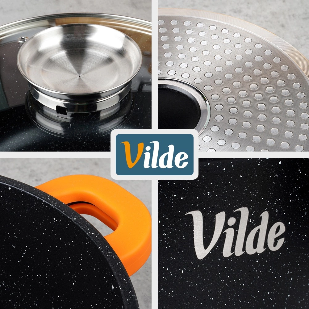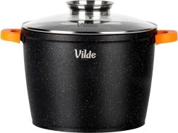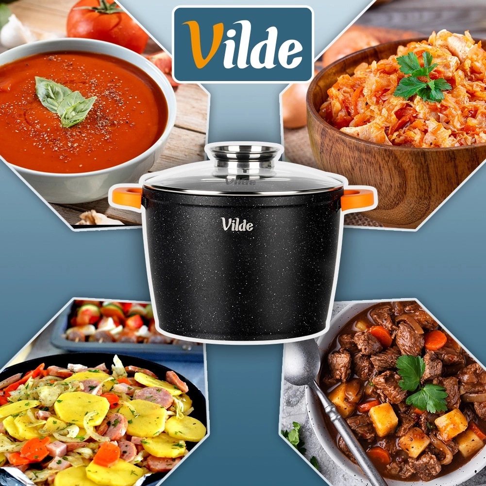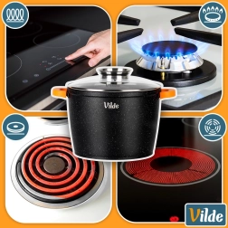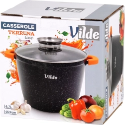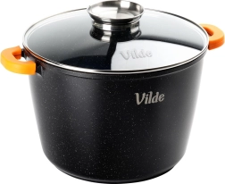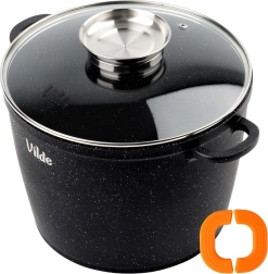 Lielas ietilpības granīta katls Vilde TERRUNA AROMA ar tilpumu 6,7 l un diametru 24 cm ir ideāls zupām, gulašiem un gaļas sautēšanai. Pateicoties nelīpošajam granīta pārklājumam varēsiet gatavot ar minimumu taukvielu, stikla vāks ar devēju ļauj pieliet šķidrumu, nepacelot vāku, bet silikona neslīdošie uzmavas uz rokturiem nodrošina drošu satvērienu. Piemērots gāzei, elektrībai, keramiskajām virsmām un indukcijai, cepeškrāsnī līdz 200 °C (bez vāka) un trauku mazgājamajā mašīnā.