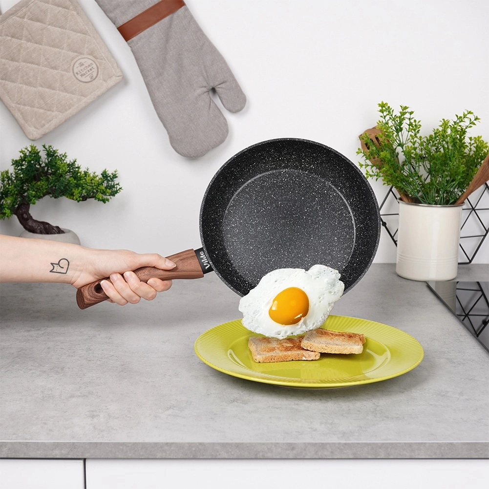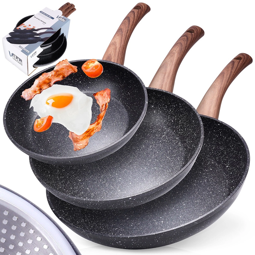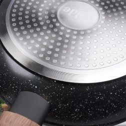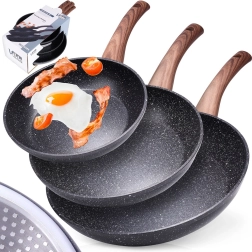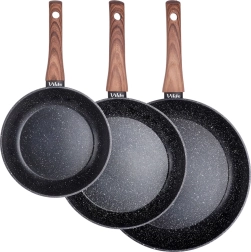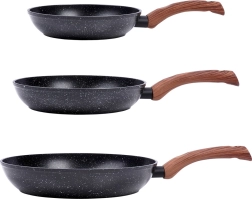Stilīgs trīs pannu komplekts 20, 24 un 28 cm ar izturīgu granīta nepiedegošu pārklājumu, vienmērīgu siltuma sadali un ergonomiskām rokturiem ar koka dekoru. Piemērots visiem plīts veidiem, tostarp indukcijai, viegli tīrāms un piemērots trauku mazgājamajai mašīnai. Ideāli piemērots veselīgai gatavošanai ar minimālu tauku daudzumu ikdienas cepšanai un sautēšanai.