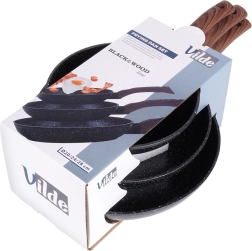 BLACK&WOOD pannu komplekts apvieno modernu izskatu ar praktiskumu jebkurai virtuvei. Trīs universāli izmēri (20/24/28 cm) ir piemēroti ātrām brokastīm, pusdienām un ģimenes vakariņām. Izturīgs granīta nepiedegošais slānis nodrošina vienmērīgu ēdiena atbrīvošanu, mazāk piedegšanas un vienkāršāku kopšanu.