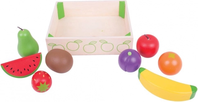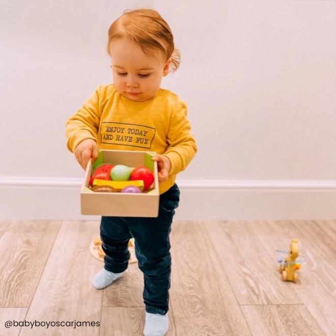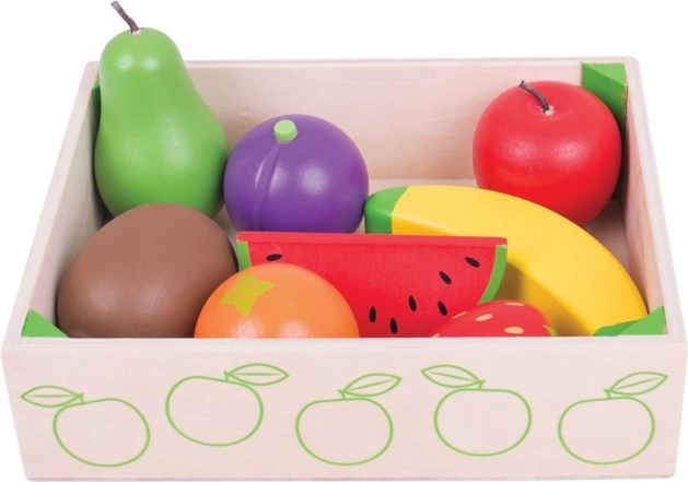 Šajā kastē atradīsiet dažādus koka augļus, piemēram, banānus, ābolus, zemenes un bumbierus. Bērniem tā ir lieliska rotaļlieta, kas ne tikai izklaidē, bet arī izglīto par veselīga un sabalansēta uztura nozīmi. Spēle ir paredzēta sīko pirkstu motorikas attīstīšanai, un rotaļu laikā bērni uzzina, no kurienes nāk viņu ēdiens un kā tas tiek pagatavots.