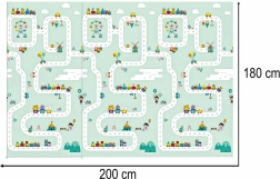 Abpusējs putu paklājiņš ar izmēriem 180 × 200 × 1 cm veido drošu un ērtu telpu rotaļām, pirmajai apvelšanās un rāpošanai. Blīvas XPE putas slāpē triecienus, pasargā no aukstuma no grīdas, bet pret-slīdes tekstūra nodrošina stabilitāti kustībā. Viena puse ar mīlīgām pandām, otra ar ceļu motīvu veicina fantāziju un mācīšanos.