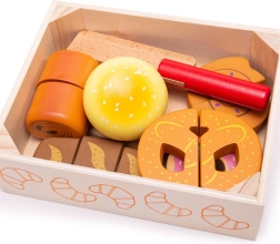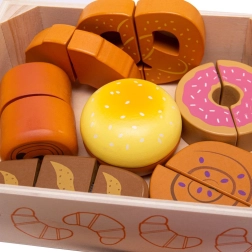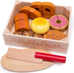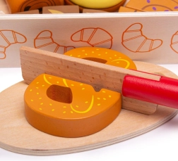 Iepazīstinām ar koka griešanas maiznīcas komplektu, kas paredzēts visiem bērniem, kuri vēlas izpētīt virtuves pasaules burvību. Šis krāsainais komplekts ietver dažādu formu izstrādājumus, piemēram, kruasānus, virtuļus un maizi, kurus var “sagriezt” ar komplektā iekļauto koka nazi. Rotaļlietas ir izgatavotas no kvalitatīva koka un savienotas ar lipekli, kas nodrošina interaktīvu un reālistisku spēli.