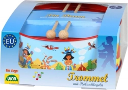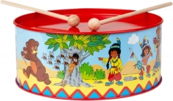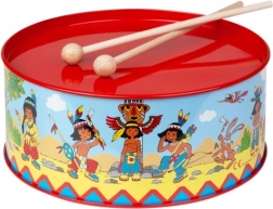 Bērnu bubins ar indiāņu rakstu, diametrs 20 cm, iepriecinās mazos muzikantus. Izgatavots no metāla, papildināts ar tekstilu un divām koka vālītēm. Komplektā ir arī aukliņa pakāršanai ap kaklu. Veicina koordinācijas attīstību, ritma izjūtu un mīlestību pret mūziku.