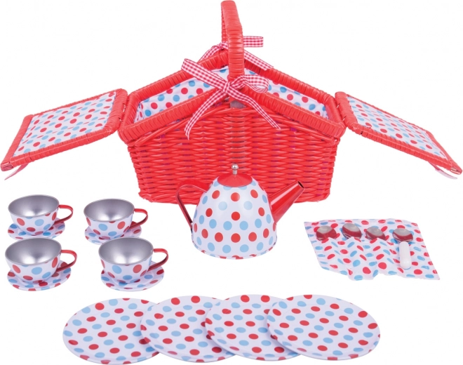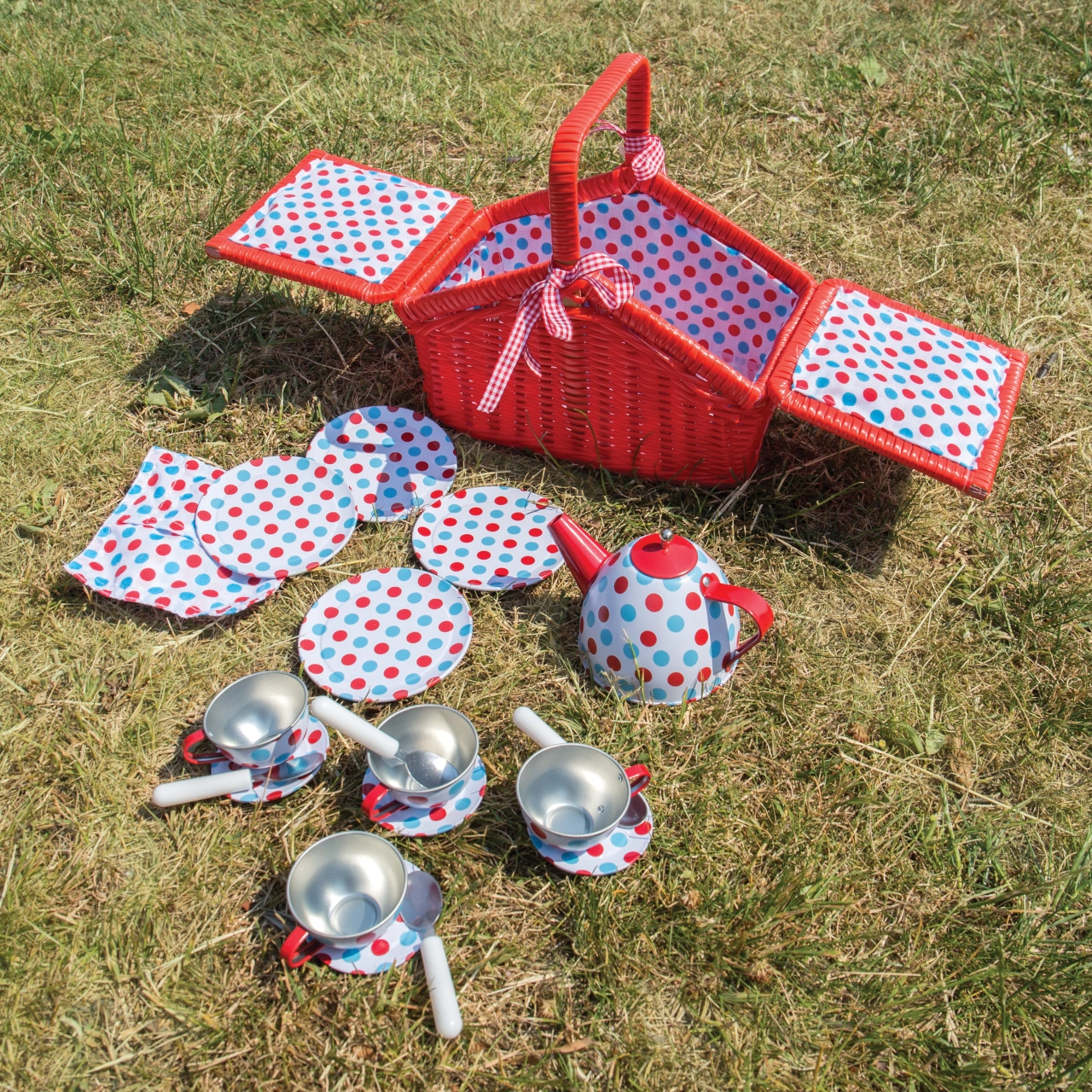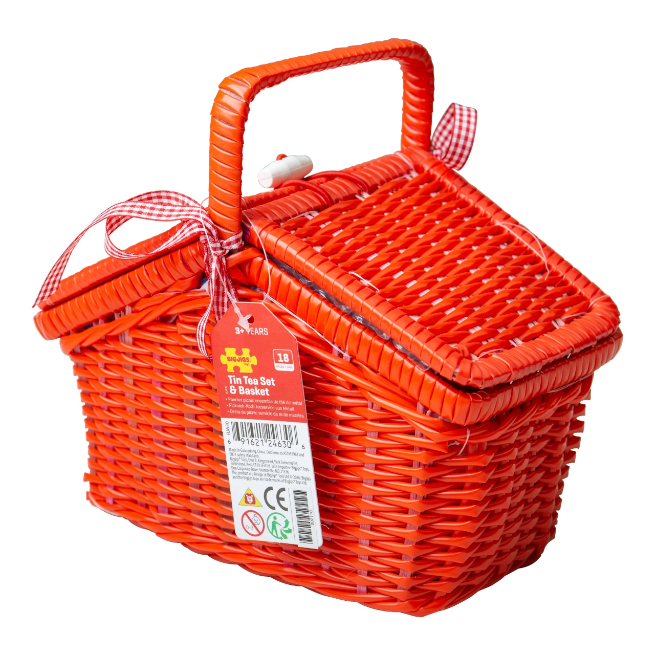 Šis skaistais tējas komplekts ir ideāli piemērots bērniem no 3 gadu vecuma. Tas ietver visu, kas nepieciešams tējas svinību rotaļām, un to visu var ērti ievietot pārnēsājamā sarkanā pītā grozā.