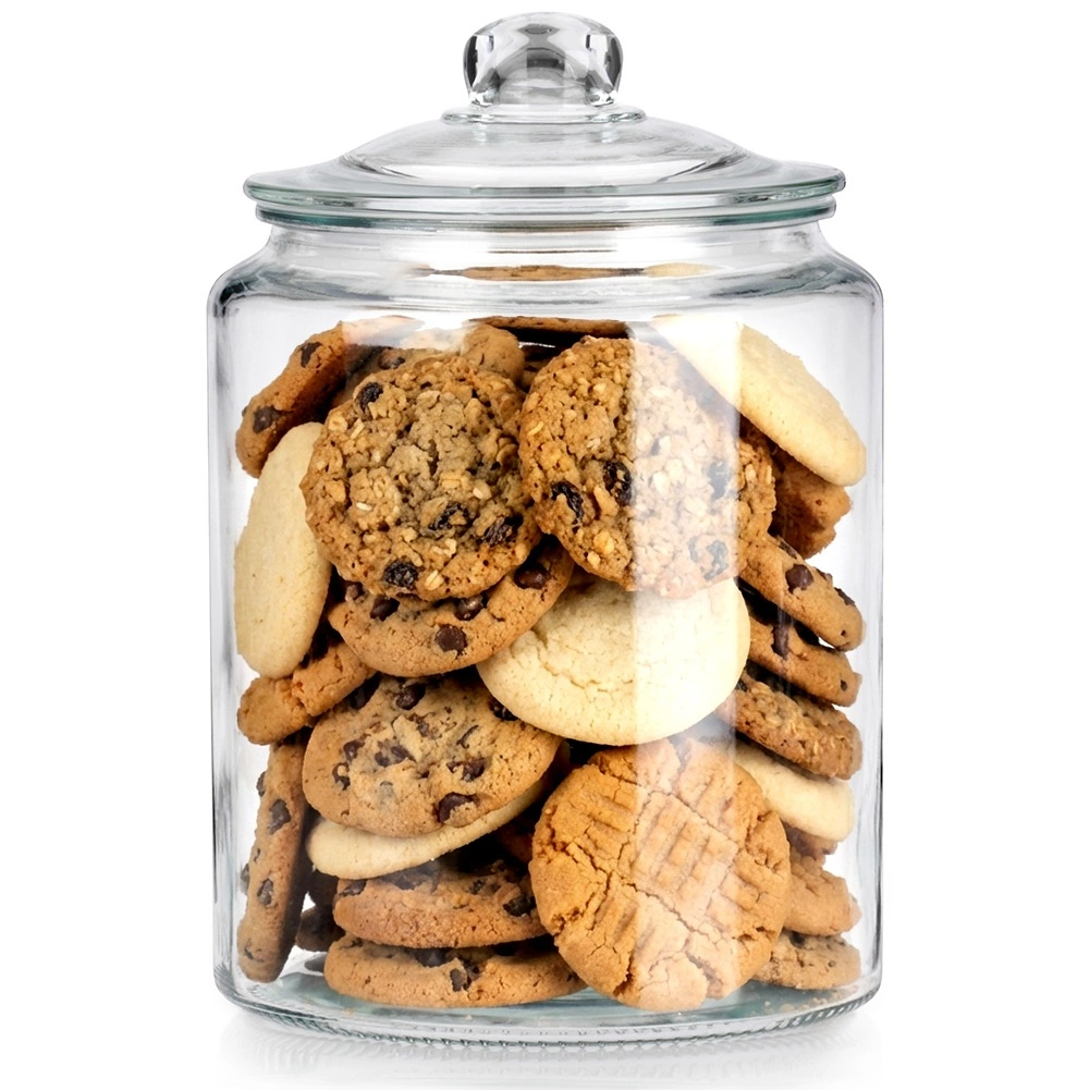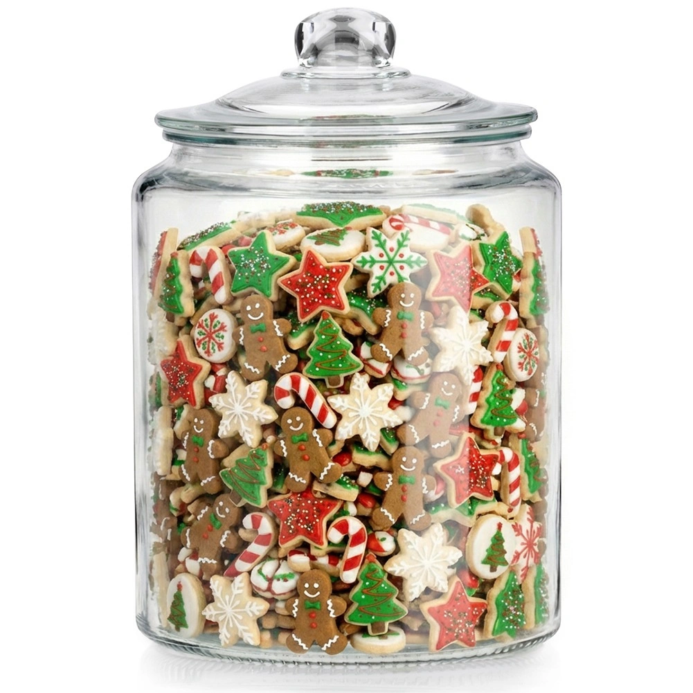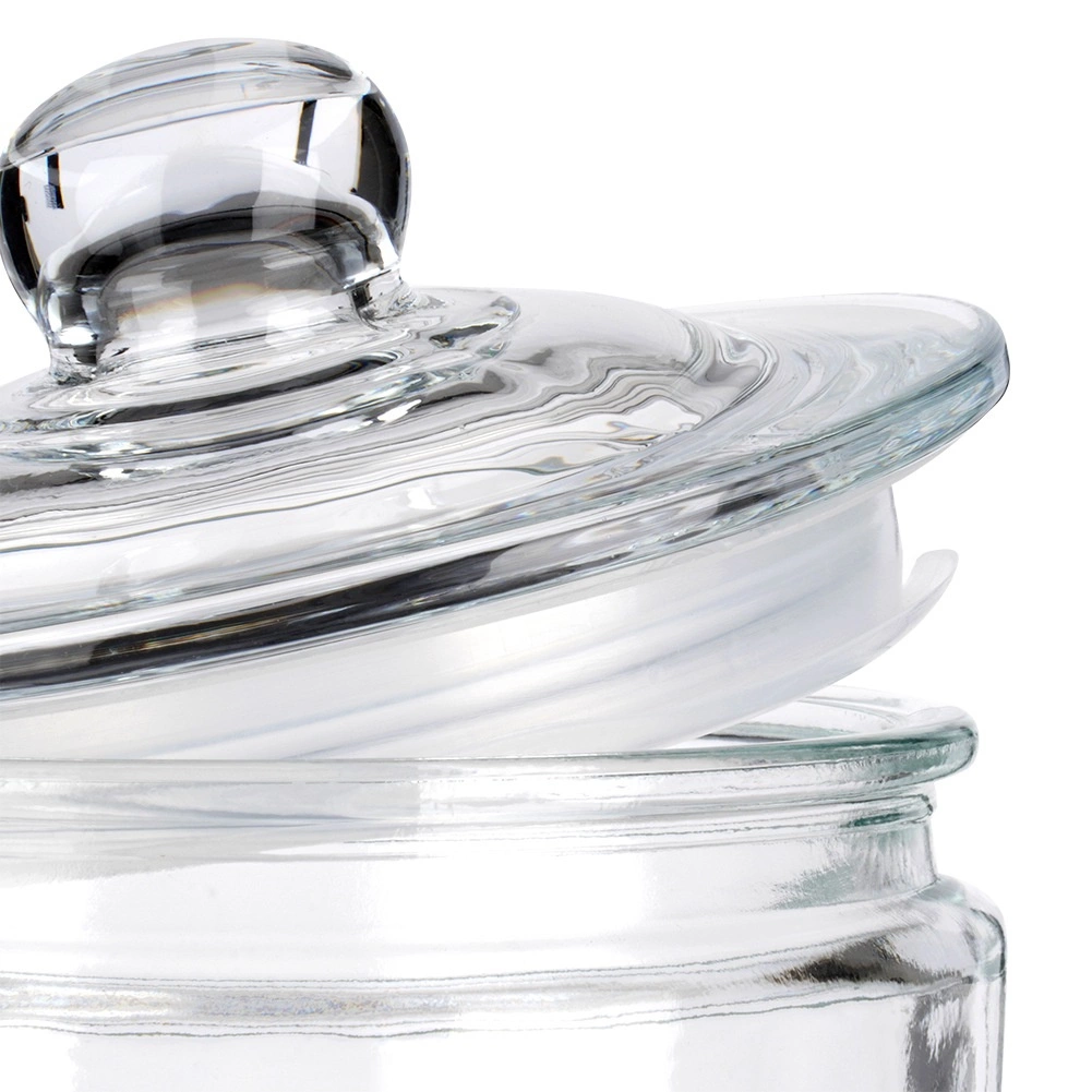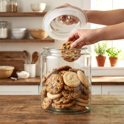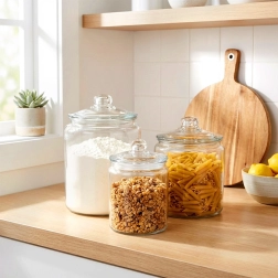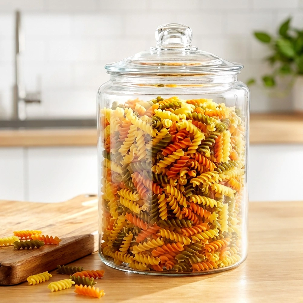 Izturīgais dzidrais stikls ļauj nekavējoties pārbaudīt krājumus un skaisti izceļ makaronus, miltus vai cepumus uz virtuves virsmas.