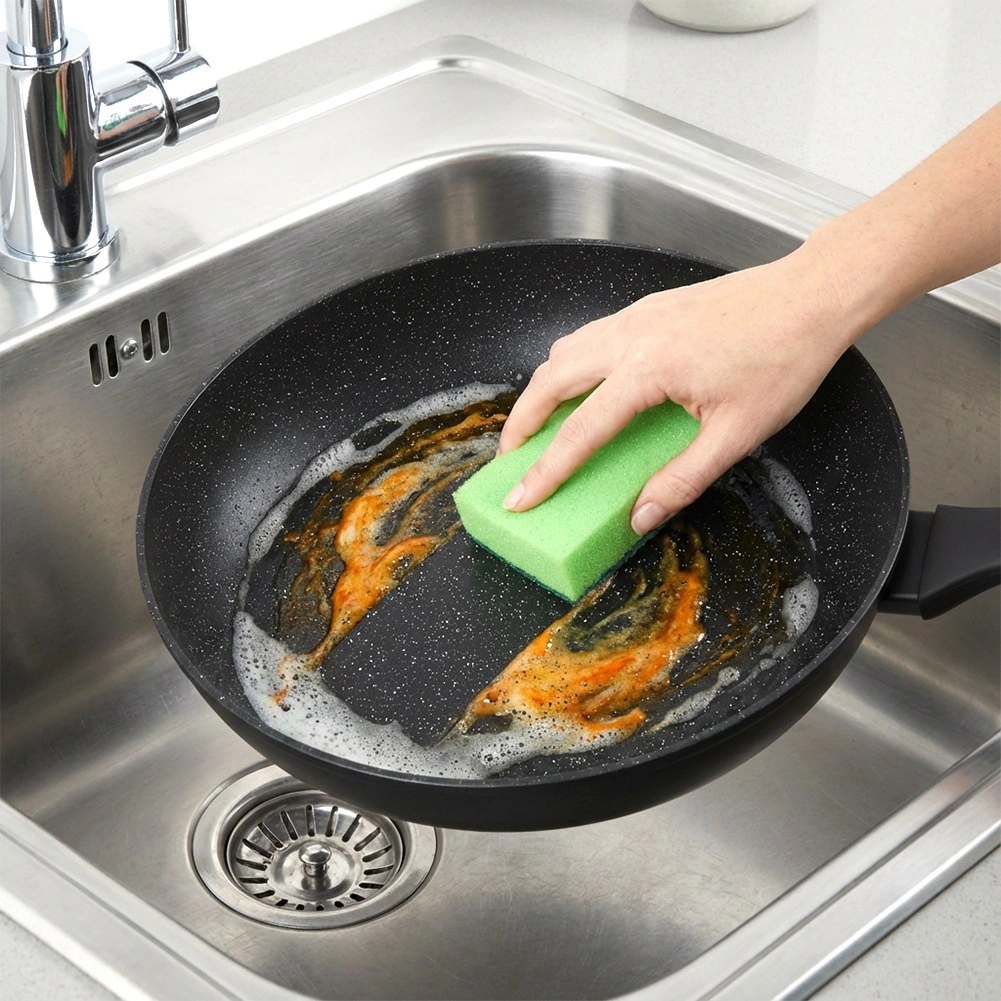 Akmeni atgādinošā virsma samazina piedegšanu un ļauj cept ar minimālu eļļas daudzumu. Ēdienu ir viegli apgriezt, un pannu ir ātri tīrīt.