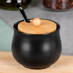 Elegants melns keramikas cukurtrauks ar bambusa vāciņu un praktisku karotīti ir ideāli piemērots ikdienas servēšanai. Tas piedāvā 250 ml ietilpību, ērtu dozēšanu, pateicoties izgriezumam vāciņā, un mūsdienīgu, minimālistisku dizainu, kas lieliski iederas jebkurā virtuvē vai kafejnīcā.