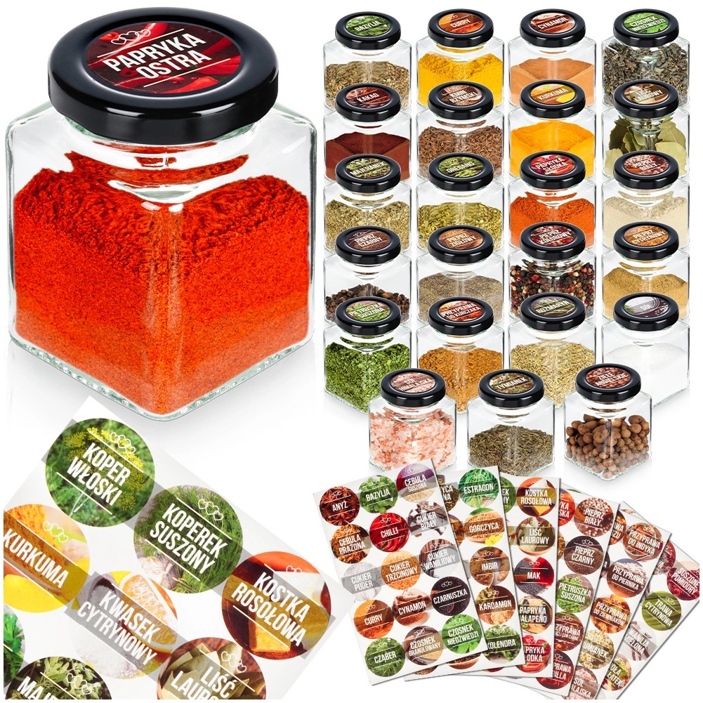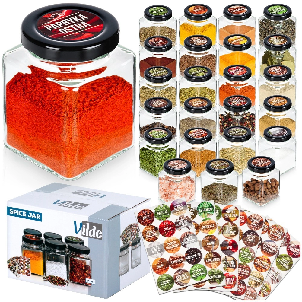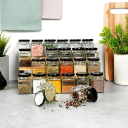 Ieviesiet virtuvē kārtību un stilu. Šis komplekts piedāvā 24 elegantas kvadrātveida garšvielu burciņas (5,5 × 5,5 × 7,5 cm, 100 ml) no caurspīdīga stikla ar melniem metāla vāciņiem, kas droši blīvē un aizsargā saturu no mitruma. Pieliktās pašlīmējošās etiķetes ar populārāko garšvielu un garšaugu nosaukumiem palīdzēs uzturēt perfektu pārskatāmību.