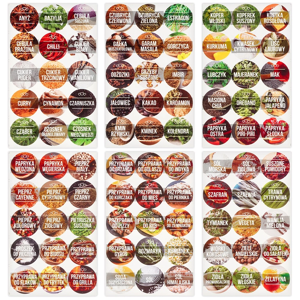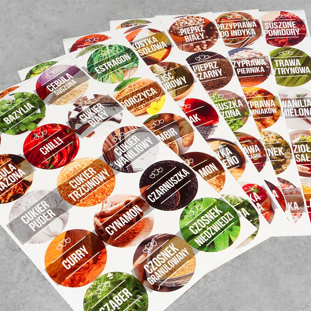 90 pašlīmējošas etiķetes ar populārāko garšvielu nosaukumiem nodrošina profesionālu izskatu un ātru pareizās sastāvdaļas atrašanu gatavošanas laikā.