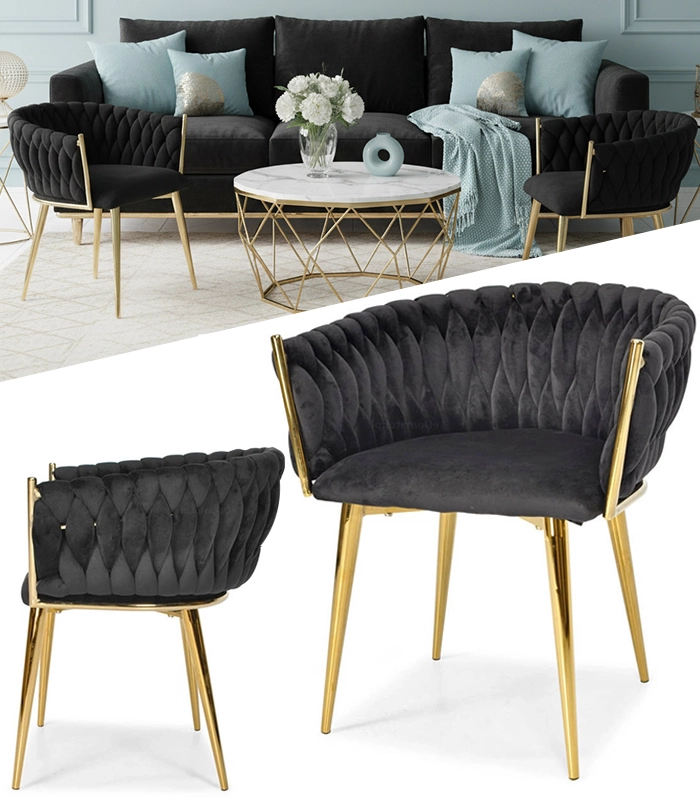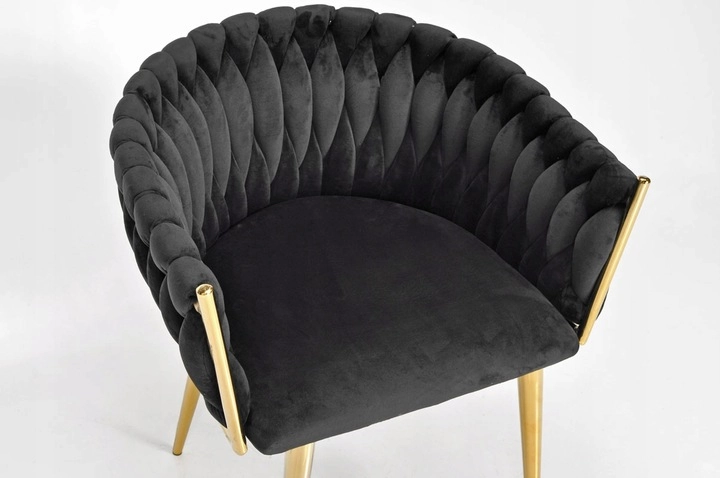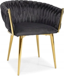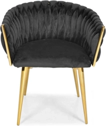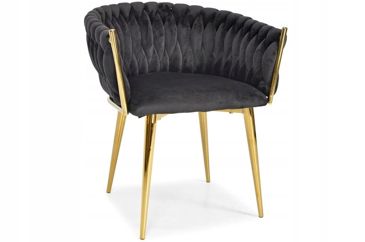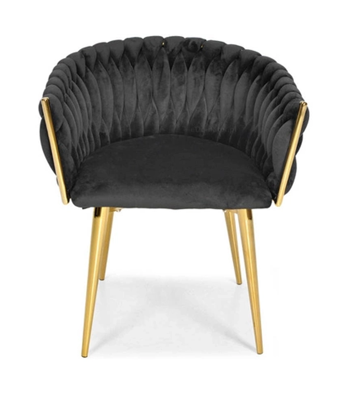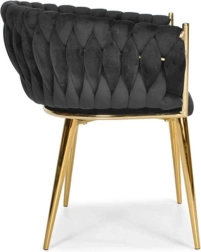 Šis polsterētais krēsls no mīksta melna samta acumirklī paceļ ēdamistabas, viesistabas vai kabineta vizuālo līmeni. Samtainā virsma viegli atstaro gaismu un piešķir mēbelei prēmium izskatu, bet zeltītās kājas izceļ mūsdienīgu glamūra stilu.