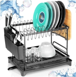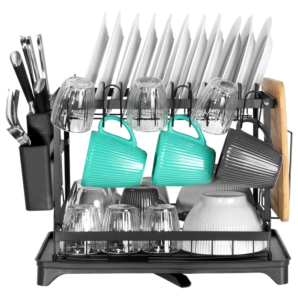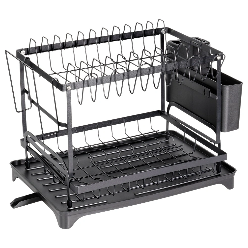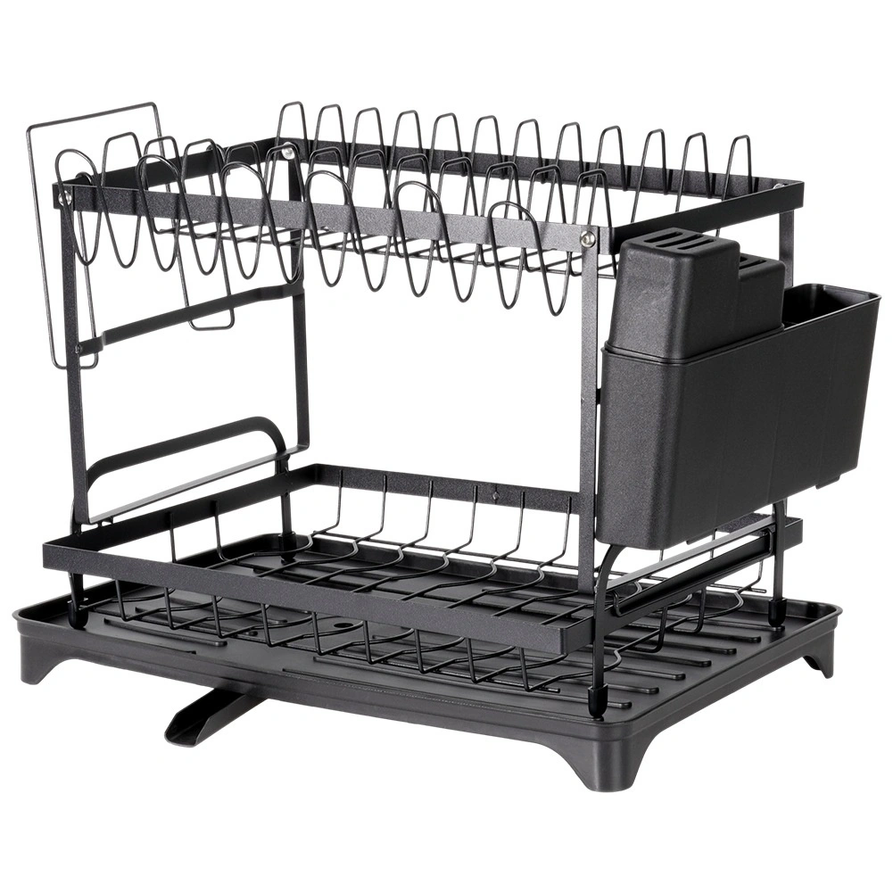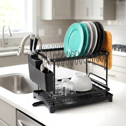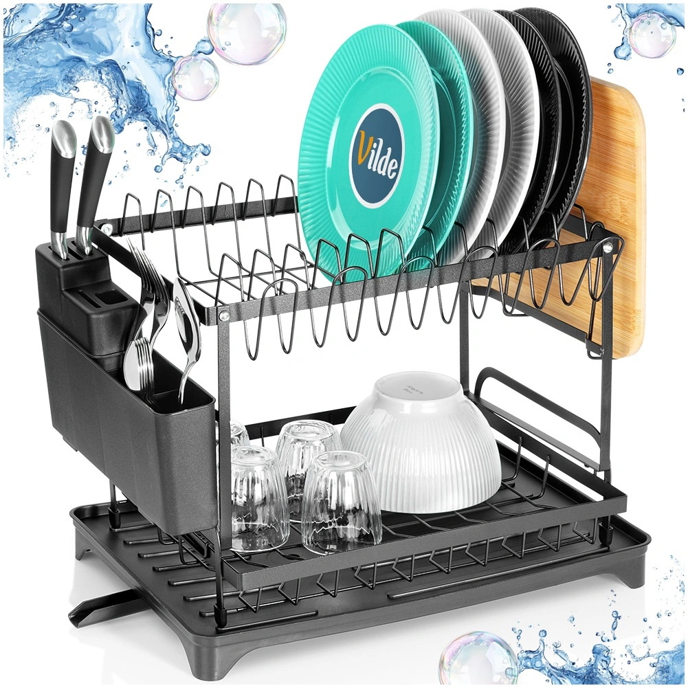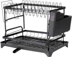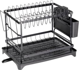 Elegants un izturīgs divlīmeņu metāla trauku notecinātājs matēti melnā krāsā piedāvā lielu ietilpību un pārdomātu organizāciju. Augšējais līmenis ietilpina līdz 11 šķīvjiem, apakšējais ir ideāls bļodām, krūzēm un glāzēm. Komplektācijā ir noņemams piederumu turētājs ar 4 nodalījumiem (viens nažiem), sānu griešanas dēlīša turētājs un paplāte ar noteci kontrolētai ūdens novadīšanai.