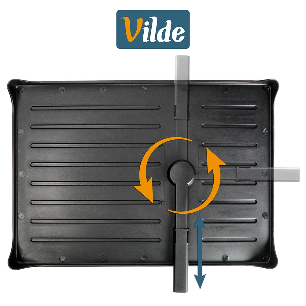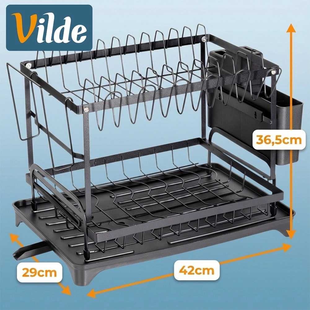 Praktisks divstāvu trauku notecinātājs ar izmēriem 42 × 29 × 36,5 cm nodrošina ātru un pārskatāmu šķīvju, glāžu un piederumu žāvēšanu. Tam ir izturīga metāla konstrukcija matēti melnā krāsā, izņemams piederumu turētājs ar četrām nodalījumiem un dēlīša turētājs. Paplāte ar noteci novada ūdeni atpakaļ izlietnē, tāpēc virtuves virsma paliek sausa. Ideāli piemērots vietas taupīšanai un organizētai žāvēšanai jebkurā virtuvē.