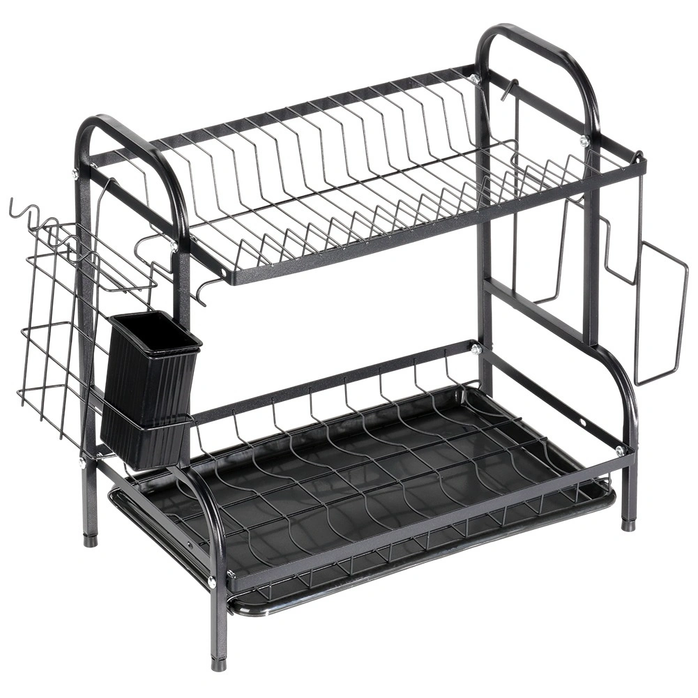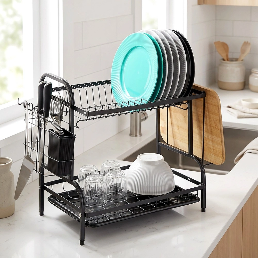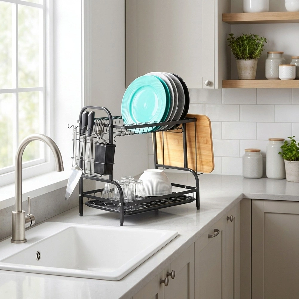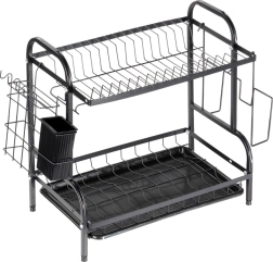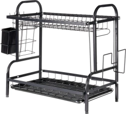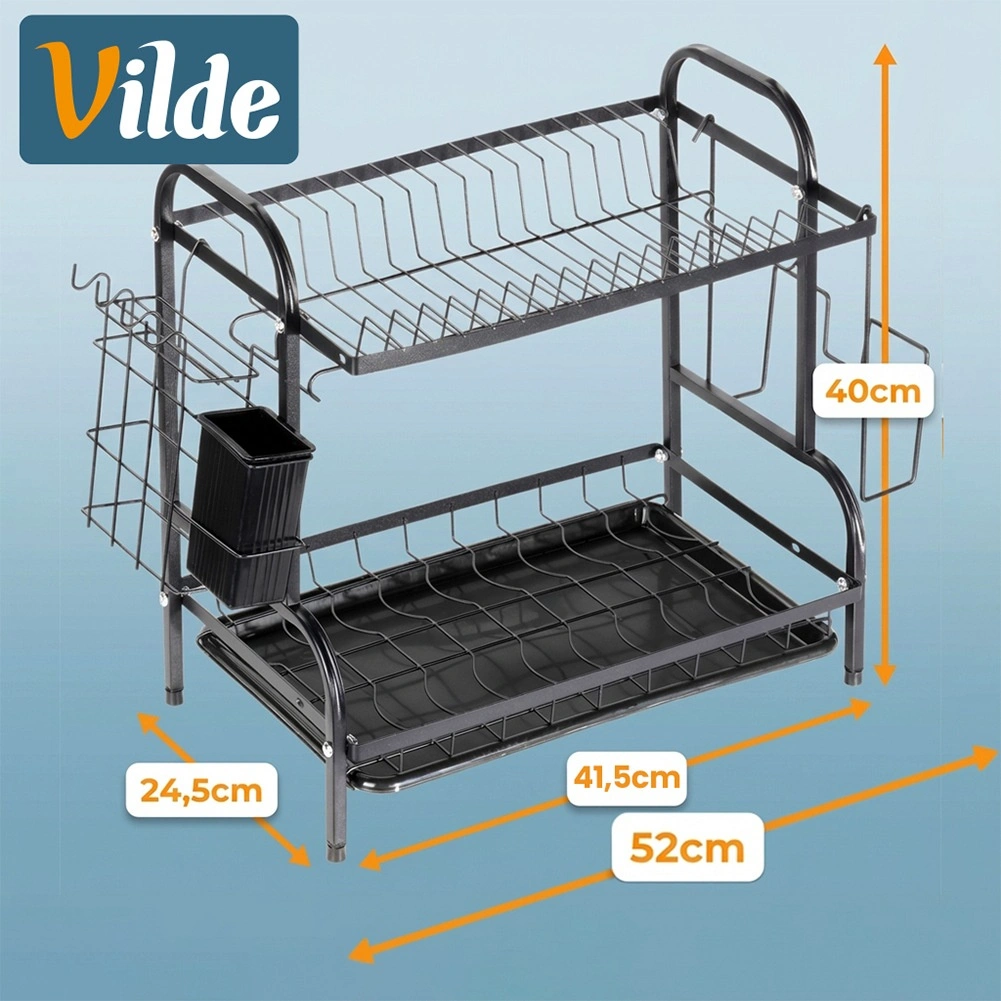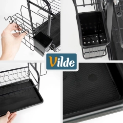 Stingra metāla konstrukcija matēti melnā izpildījumā ir izturīga un viegli kopjama. Apakšējā noteces paplāte no plastmasas savāc ūdeni un pasargā virsmu no traipiem. Risinājums ir ideāli piemērots mazākām virtuvēm un mājokļiem, kas vēlas, lai trauki vienmēr būtu pārskatāmi sakārtoti.