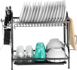 Divlīmeņu ietilpība paātrina žūšanu un palīdz uzturēt kārtību: augšā vieta līdz 16 šķīvjiem, apakšā – bļodām, glāzēm un krūzēm. Sānu piederumu groziņš ir noņemams un viegli tīrāms, turētājs dēlītim vai citiem virtuves piederumiem ietaupa vietu uz darba virsmas.