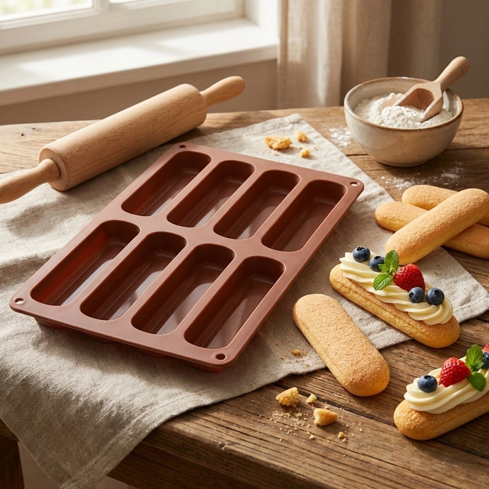 Formā ir astoņas gareniskas iedobes, pateicoties kurām sagatavosiet vienādus biskvītus, kas ir ideāli piemēroti tiramisu un desertiem glāzītēs.