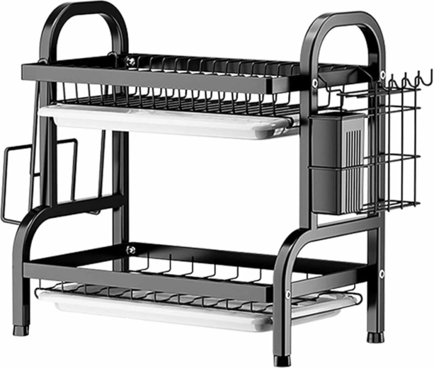 Pārdomātā konstrukcija ietver trauku grozu, galda piederumu turētāju, nažu un piederumu turētāju, dēlīša turētāju un divas noņemamas notecināšanas paplātes tīrai darba virsmai bez ūdens pilēšanas. Izturīgais rāmis no krāsota tērauda ar neslīdošām kājiņām nodrošina stabilitāti un ilgu kalpošanas laiku.