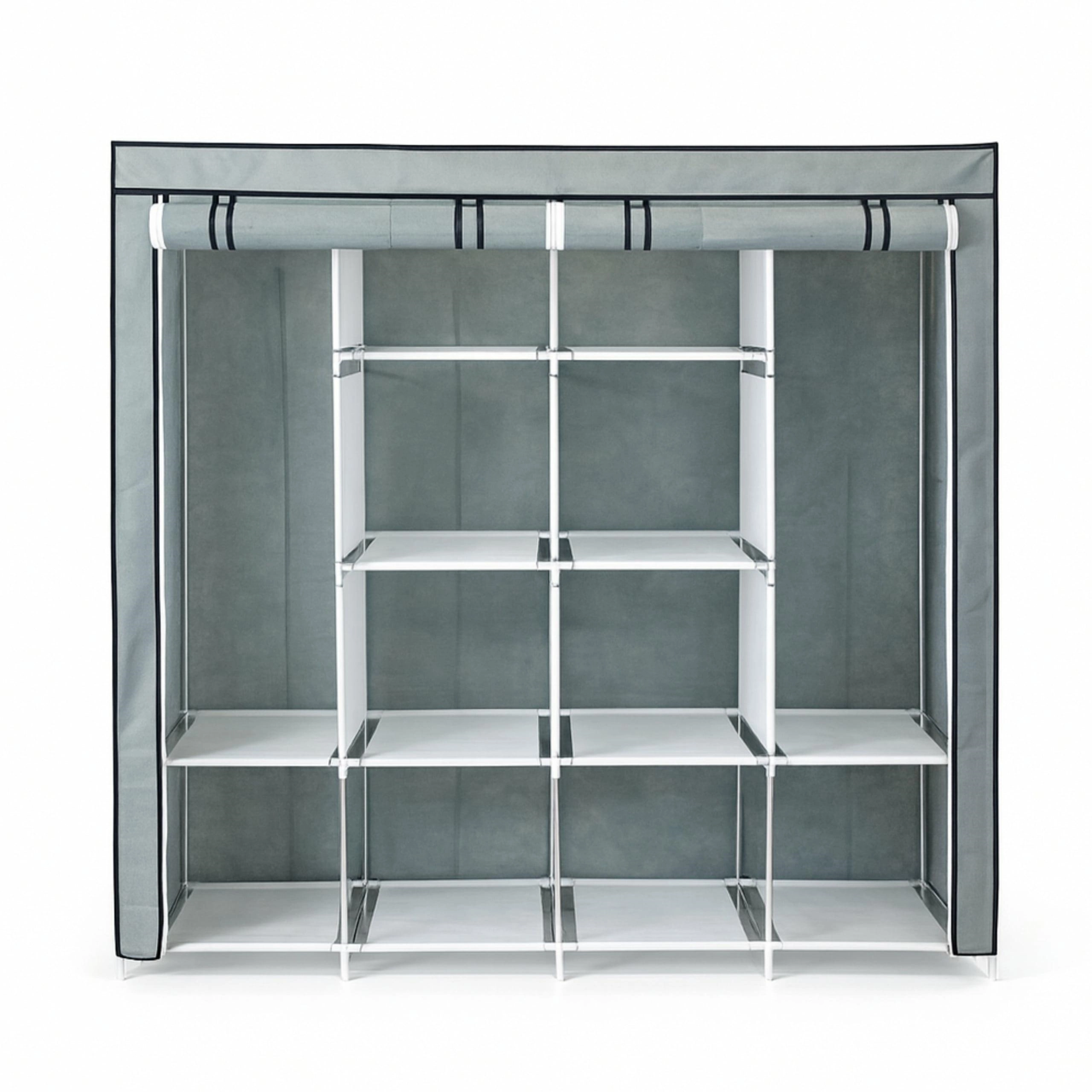 Praktisks tekstila skapis elegantā pelēkā krāsā piedāvā lielu uzglabāšanas vietu, vieglumu un mobilitāti, kā arī stabilu konstrukciju no metāla caurulēm. Pateicoties 12 plauktiem, 2 drēbju stangām un sānu kabatām, viegli sakārtosiet visu apģērbu un aksesuārus. Izturīgs pārvalks pasargā drēbes no putekļiem, un skapis ir piemērots guļamistabai, ģērbtuvei, birojam un bērnistabai.