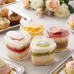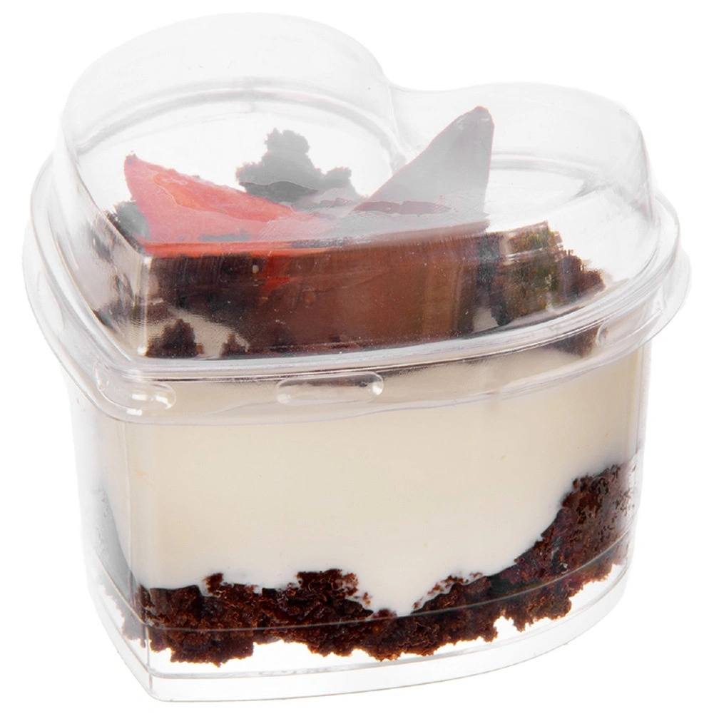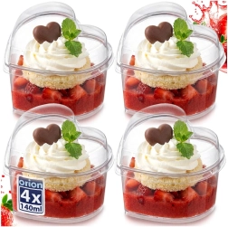 Eleganti caurspīdīgi trauciņi sirds formā ar vāciņiem un tilpumu 130 ml ir ideāli desertiem un sāļām uzkodām. Pateicoties izturīgam materiālam (izturība līdz 60 °C) un praktiskai aizvēršanai, tie ir lieliski piemēroti kāzām, ballītēm, cateringam un bērnu svinībām. Higiēniska pasniegšana un skaista kārtu prezentācija nodrošina efektu uz jebkura galda.