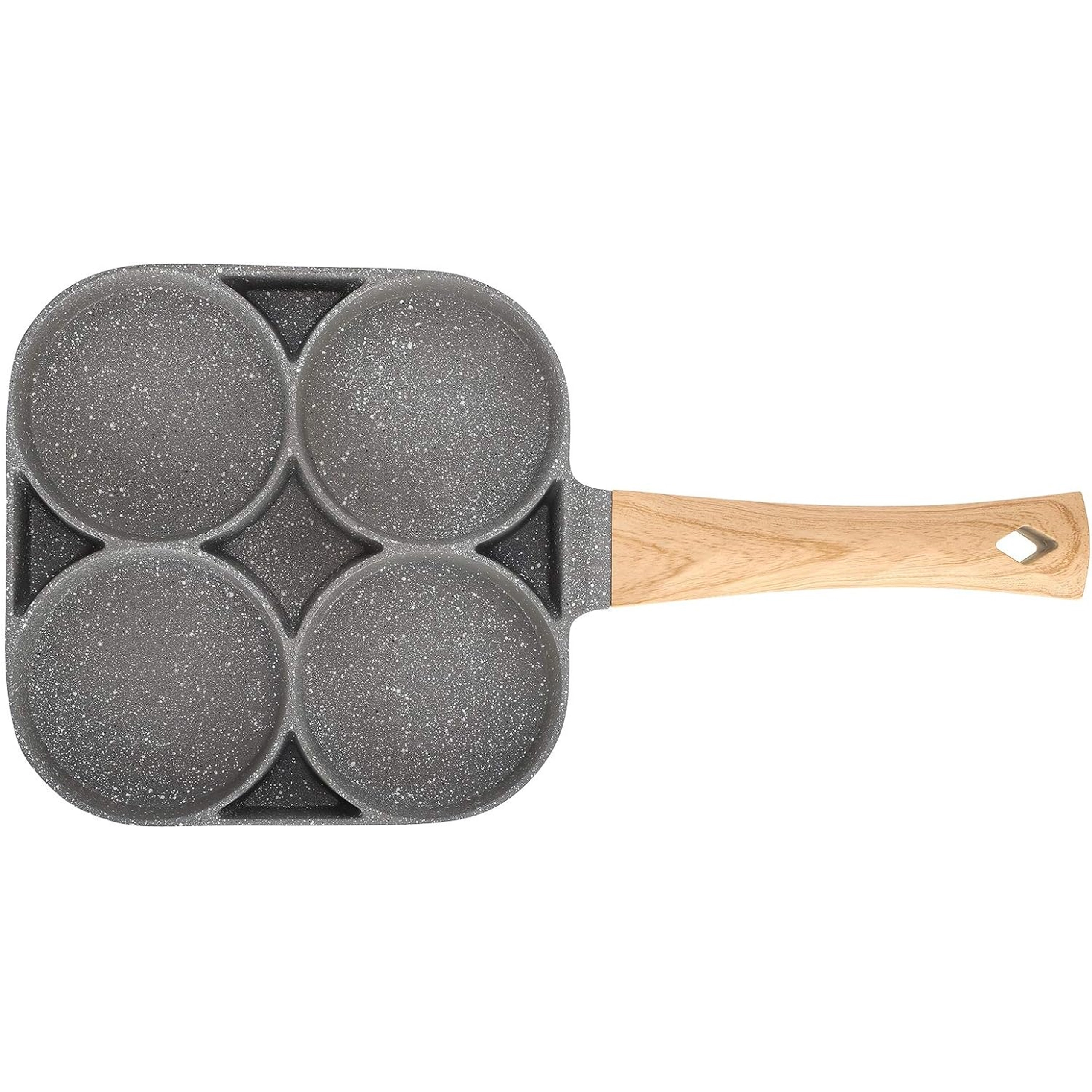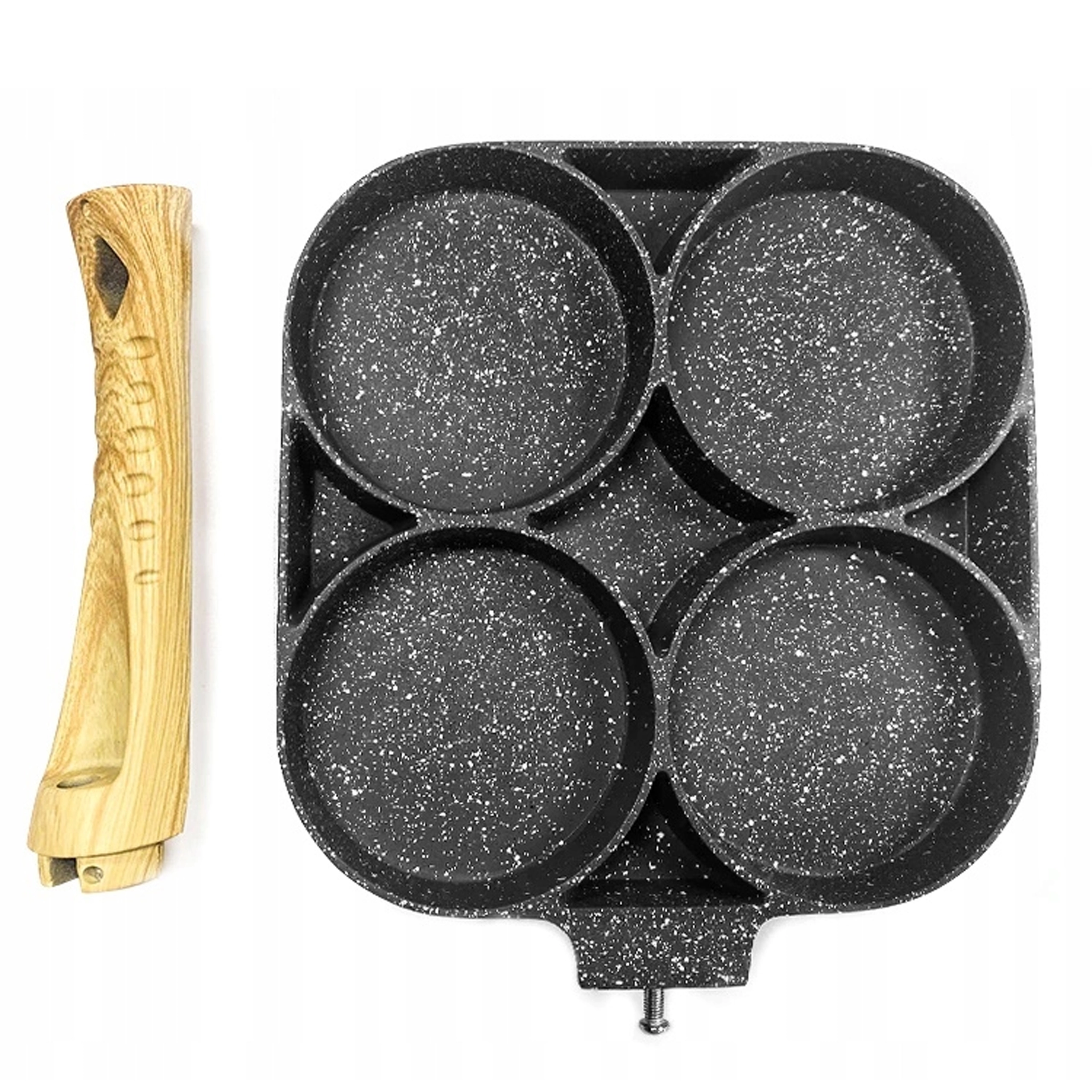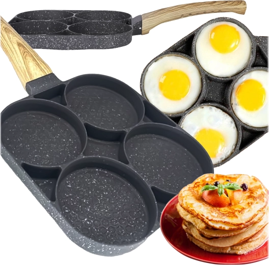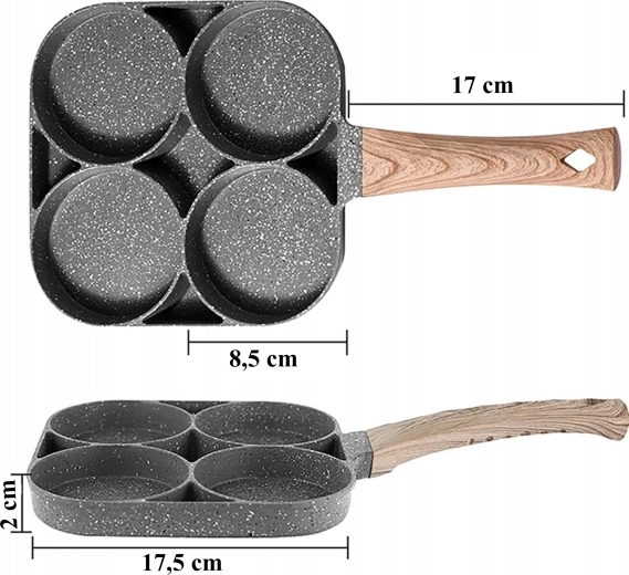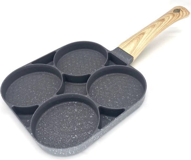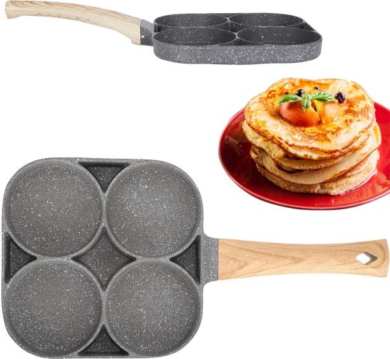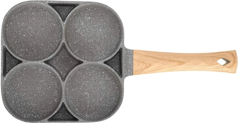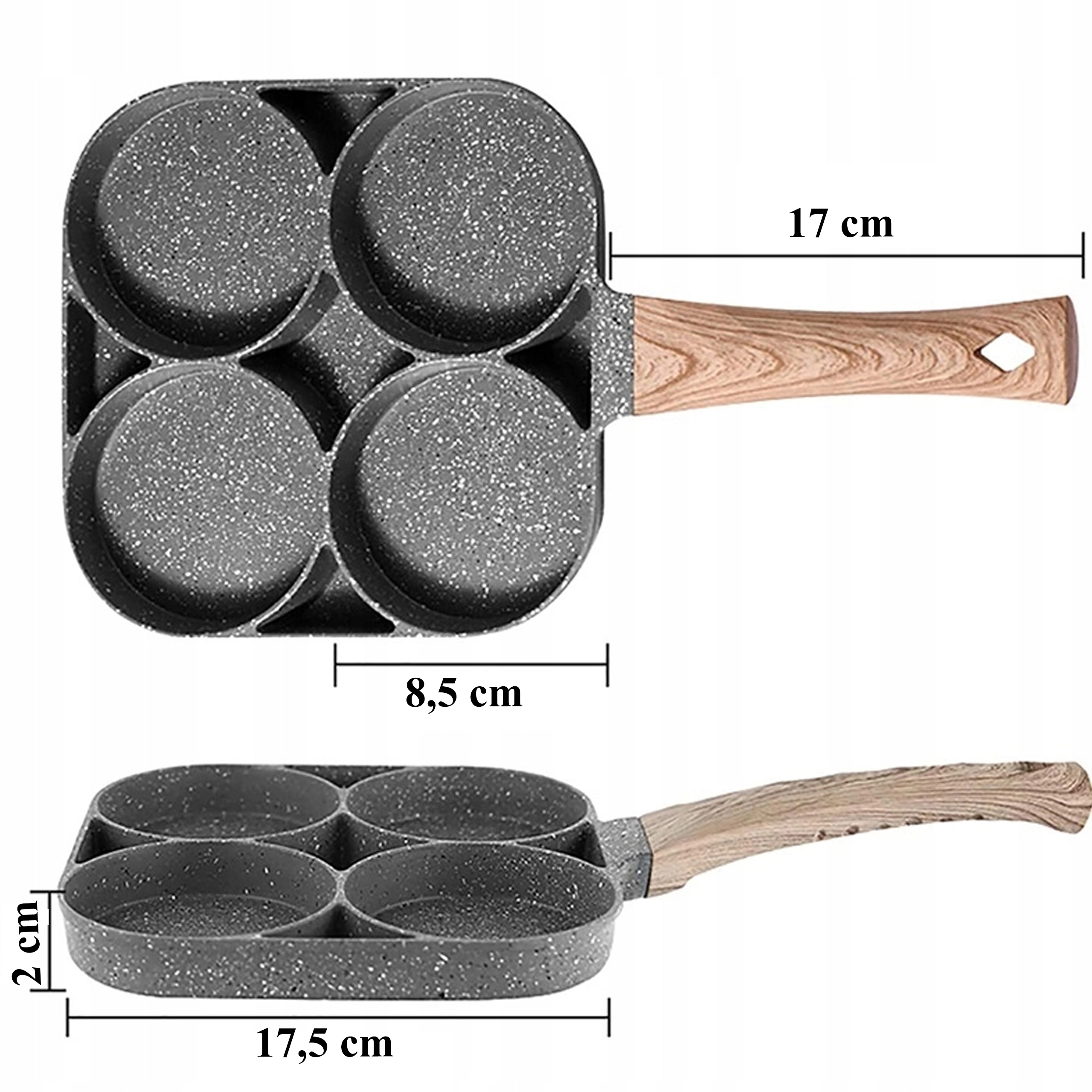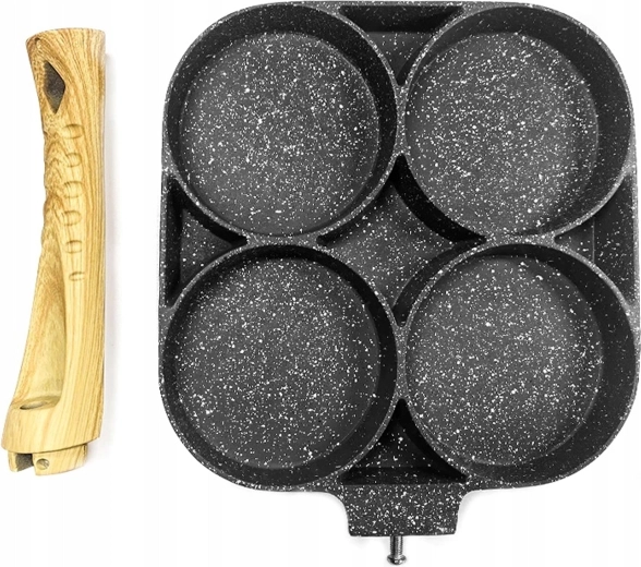 Pagatavojiet brokastis ātrāk un bez nekārtības ar šo universālo pannu ar četrām apaļām kamerām. Pateicoties nelīpošajam pārklājumam un vienmērīgai siltuma sadalei, jūs vienlaikus sagatavosiet olas, pankūkas, plāceņus un mini plānās pankūkas perfekti veidotas. Ergonomiska roktura koka izskats nodrošina patīkamu satvērienu, un panna ir piemērota indukcijai, gāzei un citiem plīts veidiem.