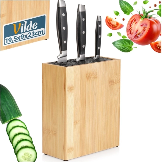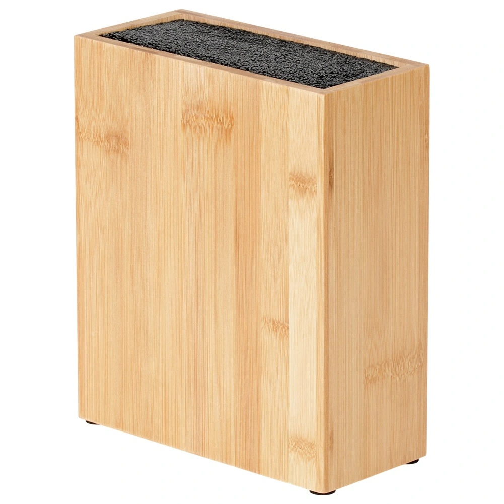 Universāls bambusa nažu bloks ar izmēriem 19,5 × 9 × 23 cm drošai un pārskatāmai virtuves nažu un piederumu glabāšanai. Pateicoties izņemamai plastmasas sariņu ieliktnītei, tas droši tur dažādu izmēru un formu nažus, nebojājot asmeņus. Izturīgais bambuss piešķir virtuvei dabisku eleganci, bet pretbuksēšanas filca paliktņi nodrošina stabilitāti uz darba virsmas.