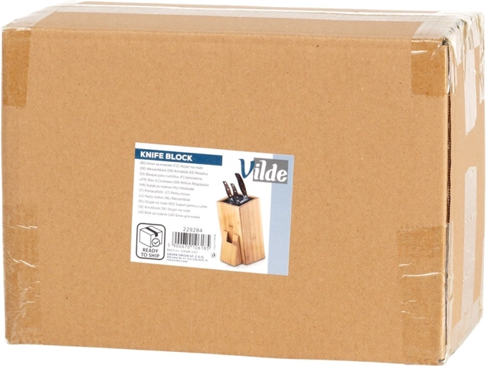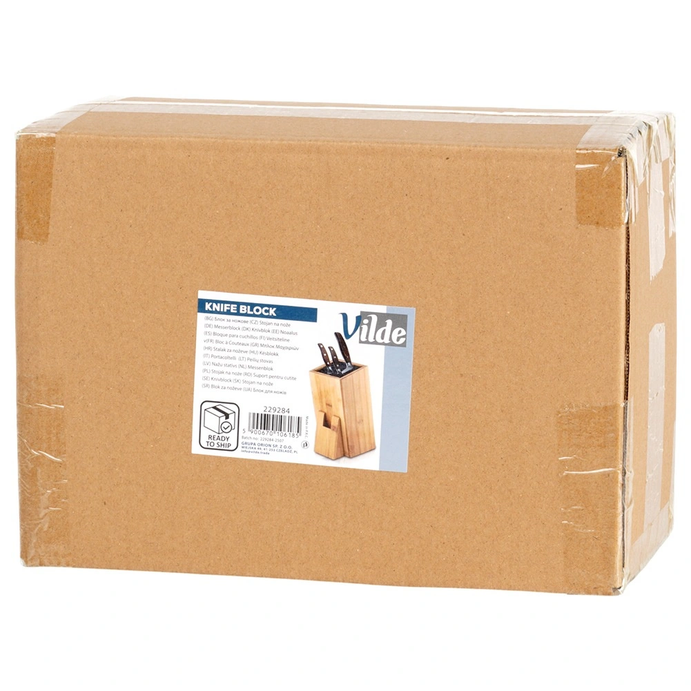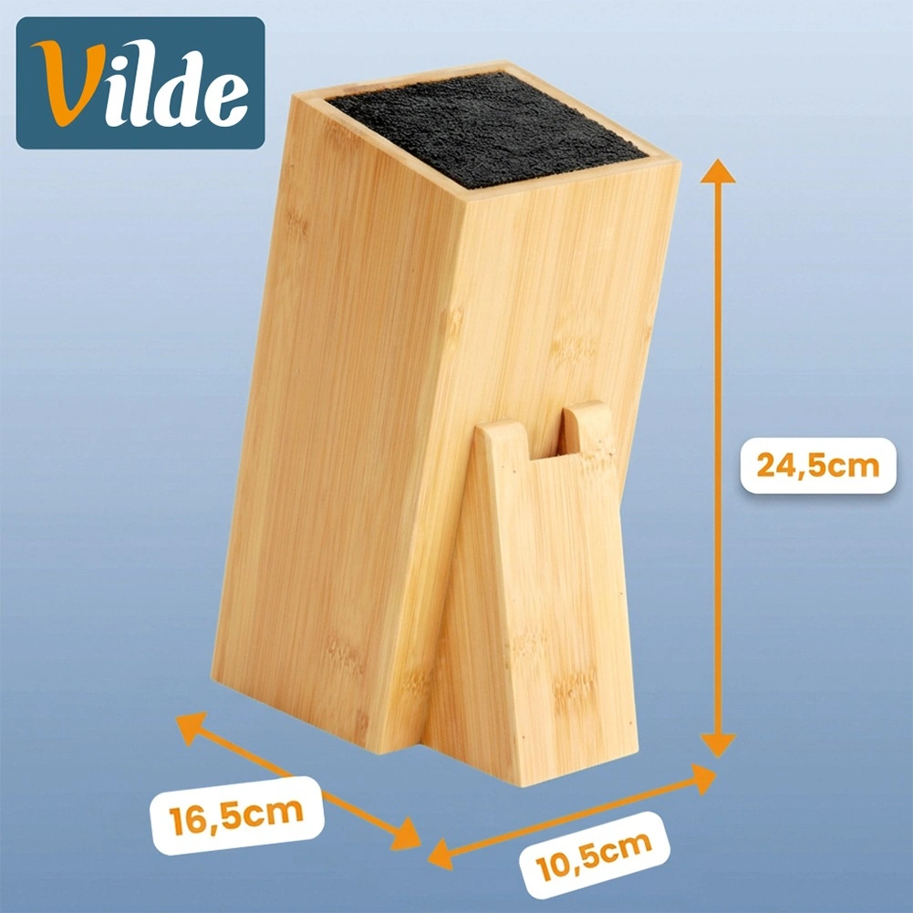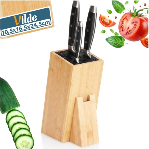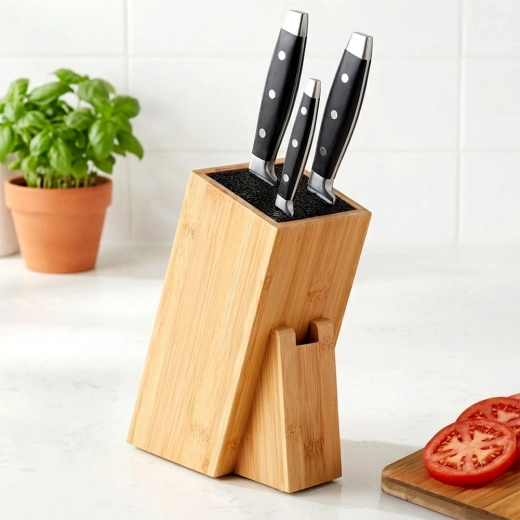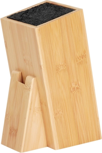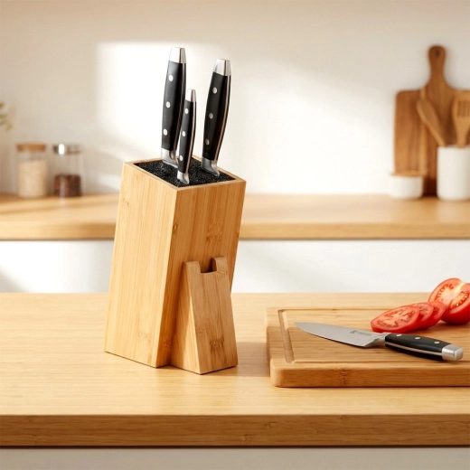 Pateicoties kompaktajiem izmēriem 10,5 × 16,5 × 24,5 cm, bloks viegli iekļaujas uz darba virsmas un tur jūsu rīkus vienmēr pa rokai. Bambuss ir izturīgs, higiēnisks un ilgtspējīgs materiāls, tāpēc statīvs ir ne tikai praktisks, bet arī saudzīgs dabai. Komplektā ir filca paliktņi saudzīgai un stabilai novietošanai uz virsmas.
