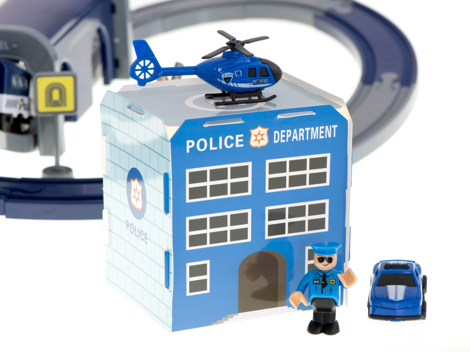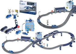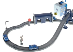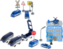 Policijas stacija ar heliportu, 4 dažādi transportlīdzekļi, helikopters, policista figūriņa un ceļa zīmes – viss reālistiskiem izsaukumiem un ceļu satiksmes noteikumu mācībai.