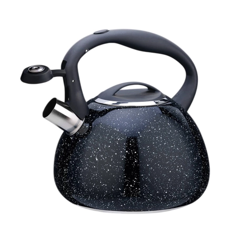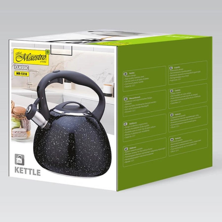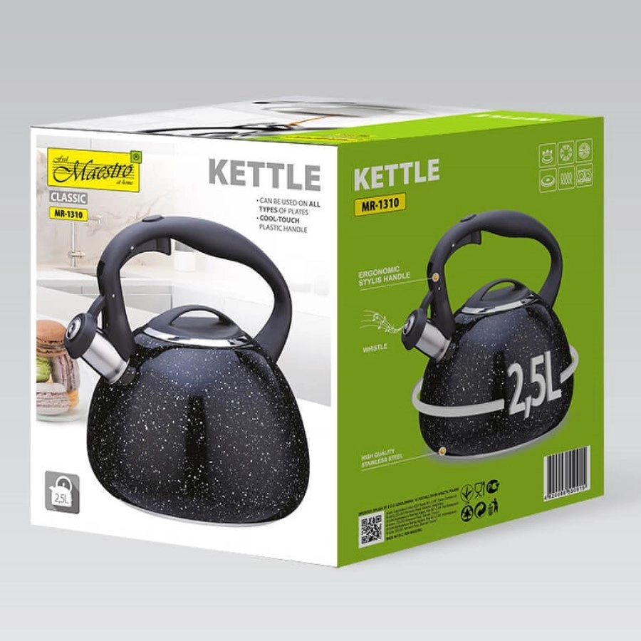 Stilīga un izturīga MAESTRO tējkanna ar 2,5 l tilpumu ir ideāla ikdienas ūdens vārīšanai. Tai ir svilpjošs snīpis drošai lietošanai, augstas kvalitātes nerūsējošais tērauds ilgai kalpošanai un daudzslāņu kapsulēta pamatne ātrai un vienmērīgai uzsildīšanai. Pateicoties noņemamam vākam, to ir viegli piepildīt un tīrīt, un tā ir piemērota visiem plīts veidiem, tostarp indukcijai.