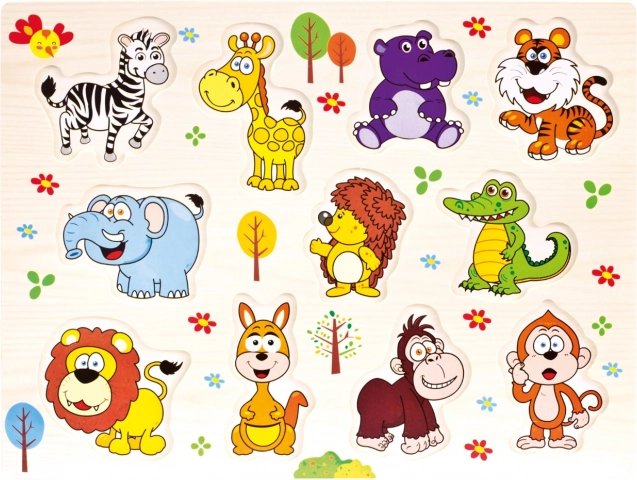 Šī lielā koka puzle ar safari dzīvniekiem iepriecinās mazos pētniekus. Krāsainie ieliekamie gabaliņi ir viegli satverami un palīdz bērniem trenēt motoriskās prasmes un loģisko domāšanu. Stabilā koka pamatne saglabā formu un nodrošina ērtu salikšanu.