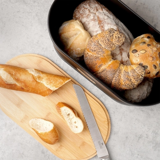 Ovālā maizes kaste ierobežo gaisa piekļuvi un pasargā maizīti no izžūšanas. Ideālie izmēri 34 × 18,5 × 15 cm ikdienas krājumiem.