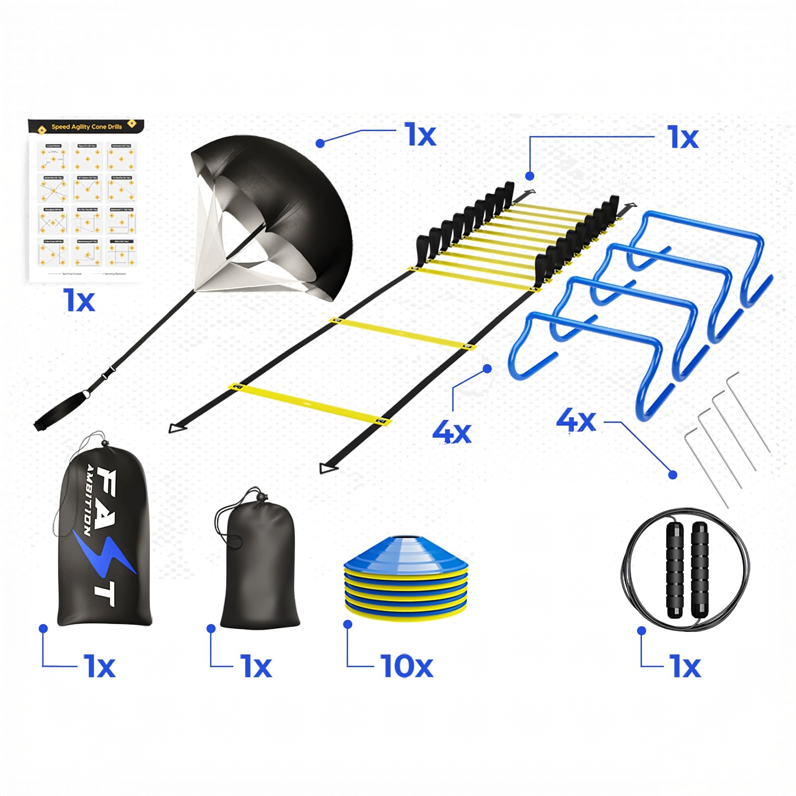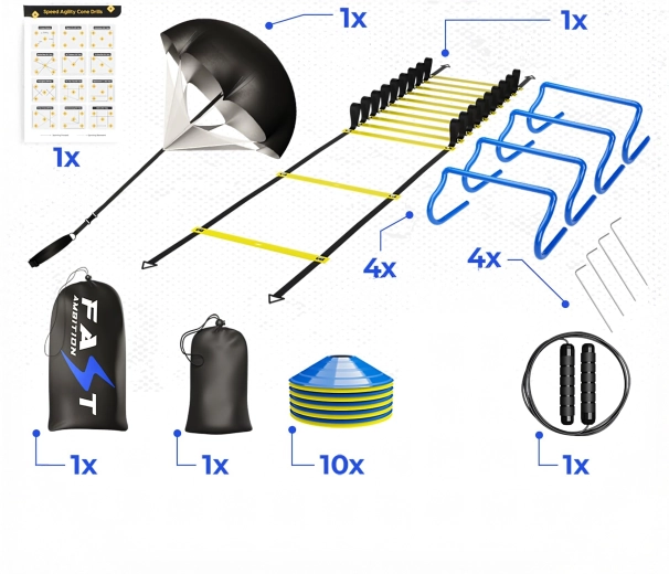 Pilns treniņu komplekts ātrumam, veiklībai un koordinācijai ietver koordinācijas trepes, mini barjeras, atzīmju konusus, lēkšanas auklu, enkurošanas mietiņus un pretestības izpletni. Ideāli futbolam, vieglatlētikai un mājas fiziskajai sagatavotībai. Pateicoties regulējamām šķērslatām, izturīgam izpildījumam un praktiskiem maisiem, komplekts ir viegli pārnēsājams un gatavs intensīviem vingrinājumiem jebkur.