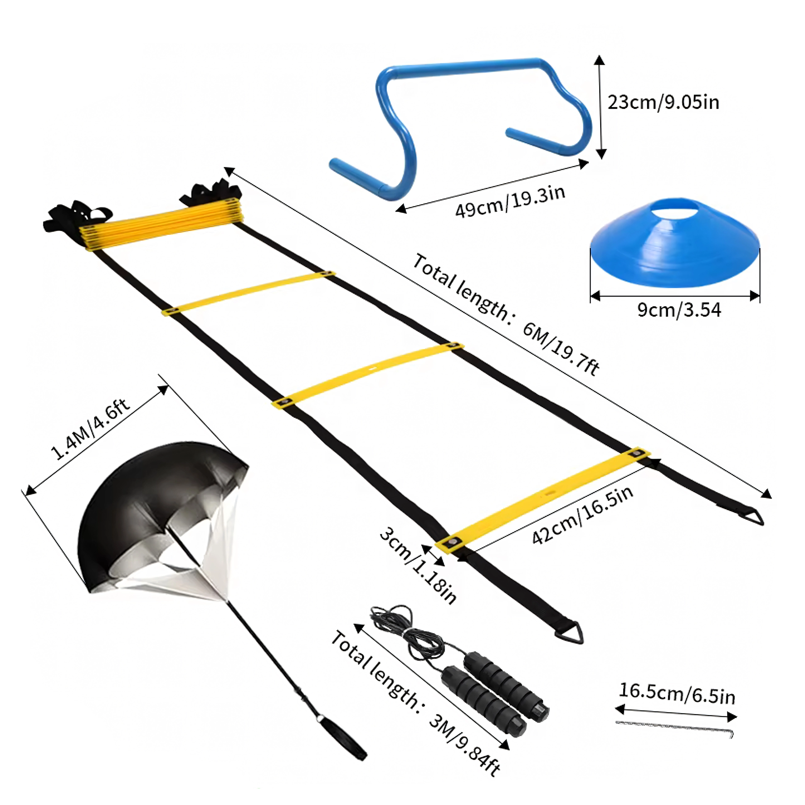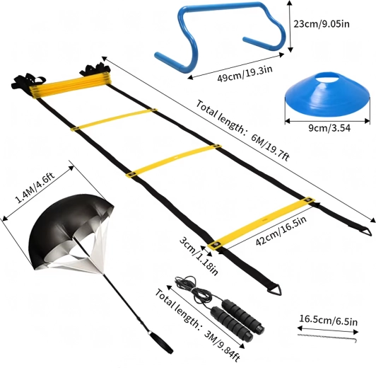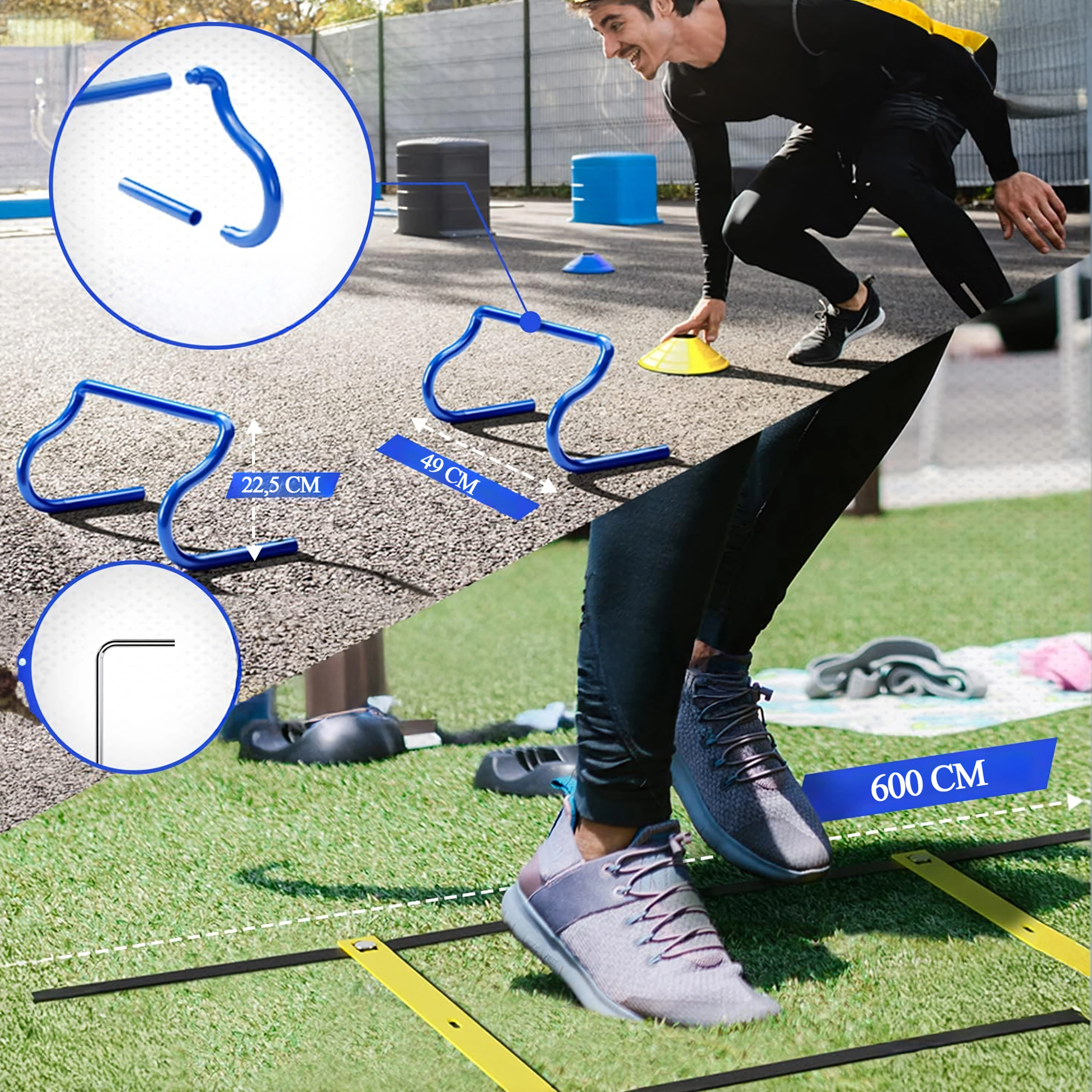 Šis universālais XXL treniņu komplekts ir paredzēts sportistiem visos līmeņos. Tas efektīvi palīdz attīstīt kāju ātrumu, akselerāciju, virziena maiņas un koordinācijas precizitāti. Visi elementi ir viegli, izturīgi un ātri lietojami gan laukumā, gan sporta zālē.