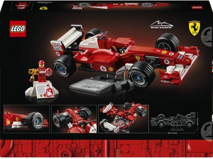 Svini F1 zelta ēru ar ekskluzīvo LEGO Icons Ferrari F2004 un Maikla Šūmahera minifigūriņu. Detalizētais leģendārā vienvietīgā bolīda modelis piedāvā darbojošos stūrēšanu, reālistisku kokpitu, V10 rindas motoru un Bridgestone Potenza bremzētās riepas. Komplektā ir arī prezentācijas statīvs ar statistiku, minifigūriņa ar ķiveri un trofeju un stilīgs pjedestāls ar apdruku un citātu. Lieliska dāvana F1 faniem un elegants eksponāts izstādei.