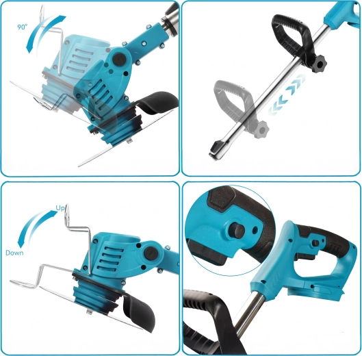 Plastmasas naži zālei, metāla naži un zāģripši izturīgākam zelmenim. Ātra maiņa palielina instrumenta universālumu.
