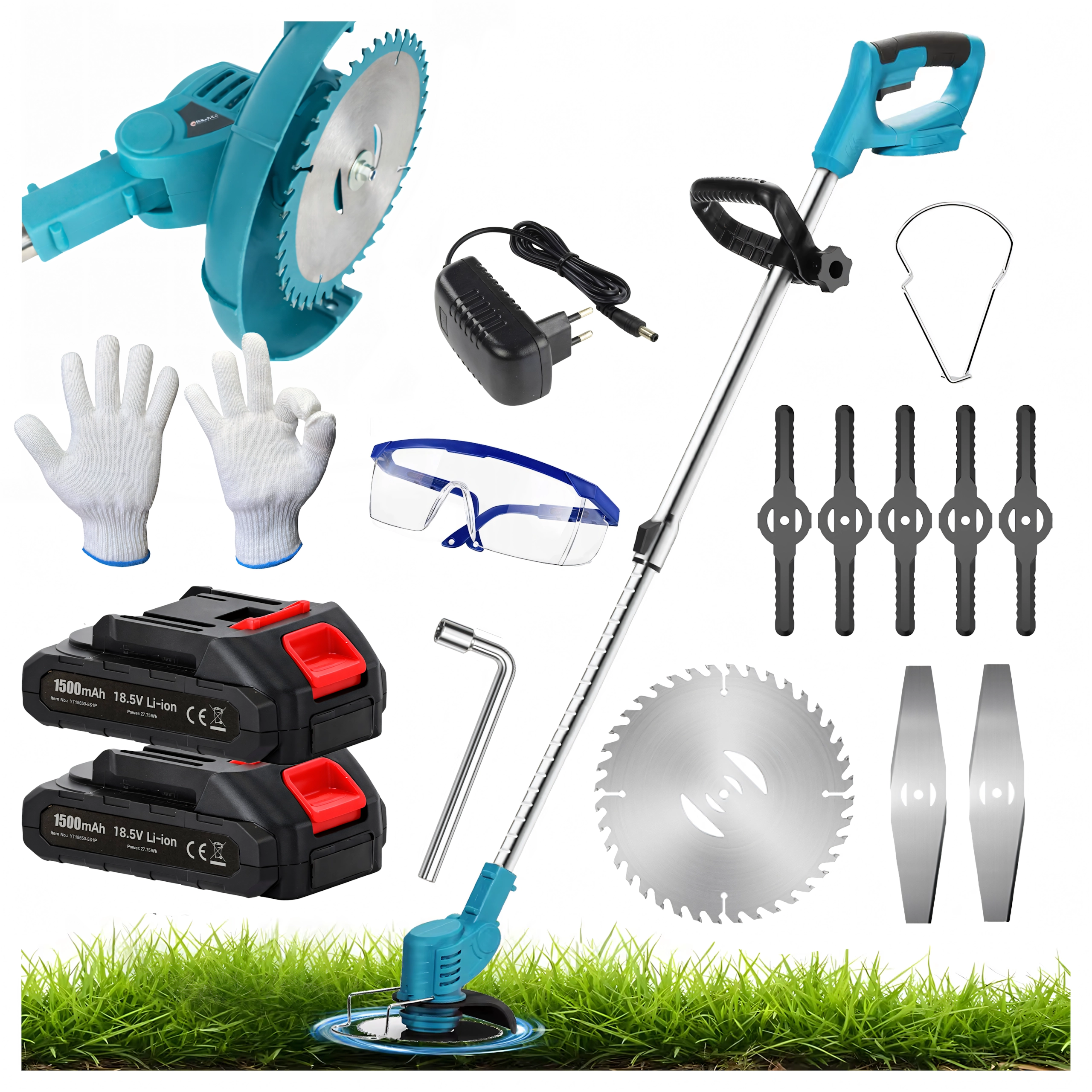 Bagātīgajā komplektā ietilpst maināmi asmeņi (plastmasas smalkai pļaušanai, metāla un zāģripši biezākam zelmenim), 2× Li‑ion baterija, lādētājs un aizsardzības līdzekļi. Drošības aizsargs pasargā no netīrumu atlidošanas, bet ergonomiskā konstrukcija mazina nogurumu ilgstoša darba laikā.