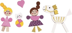 Koka izpildījums ir patīkams pieskārienam un izturīgs ikdienas rotaļās. Komplekts ir ideāli piemērots pirmajām radošajām spēlēm no 3 gadu vecuma – tas attīsta sīko pirkstu motoriku, loģiku, pacietību un stāstīšanas prasmes. Pateicoties kompaktajiem izmēriem, tas ir ērts arī līdzi ņemšanai.