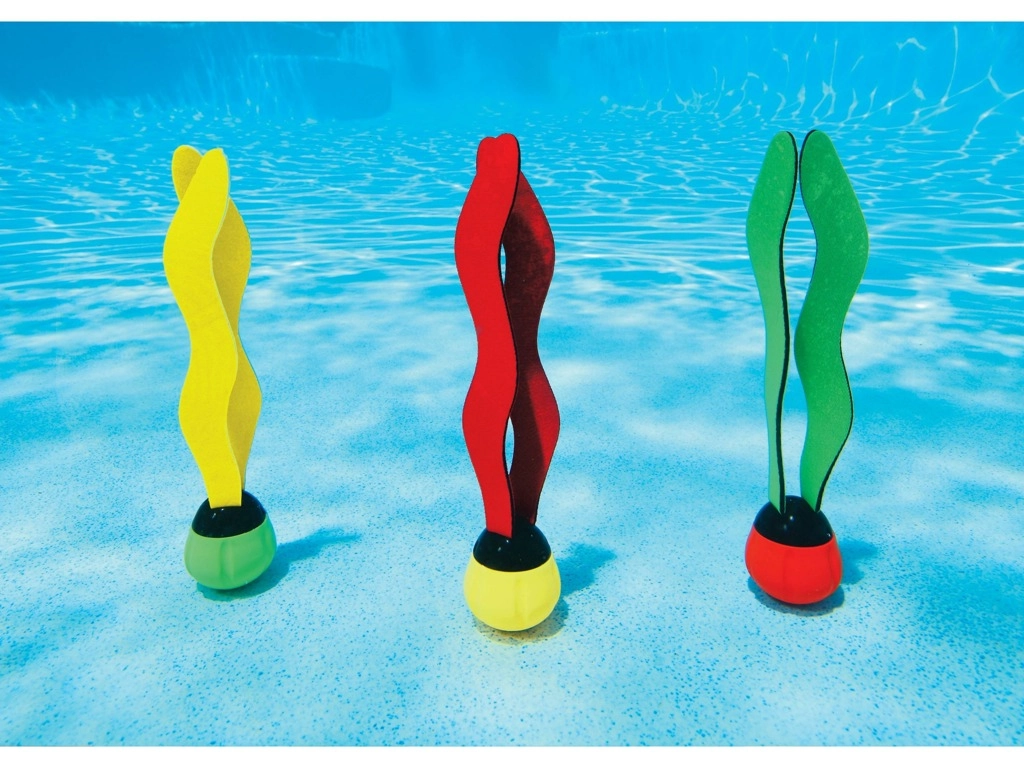 Aizraujošs niršanas rotaļlietu komplekts bērniem no 6 gadu vecuma veicina peldēšanas un niršanas treniņus. Iemetot ūdenī, rotaļlietas pateicoties svarotajai pamatnei nostājas baseina dibenā, kur kalpo kā krāsaini mērķi izcelšanai. Tās izgatavotas no mīkstas plastmasas ar tekstiltautām un pieejamas 3 košās krāsās lieliskai redzamībai zem ūdens.