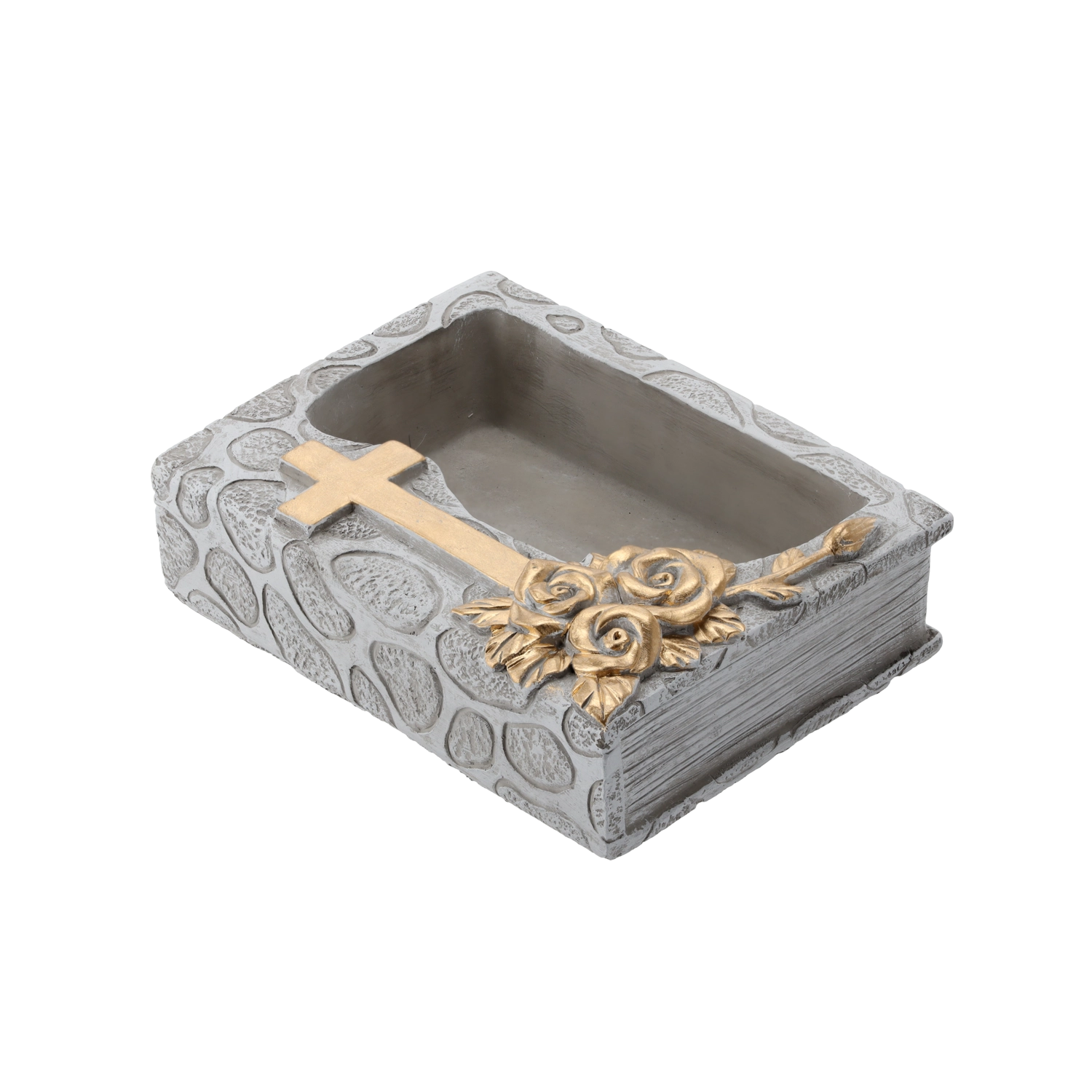 Elegants kapsētas puķupods slēgtas grāmatas formā ar dekoratīvu krustu. Izgatavots no izturīga cementa pelēkā krāsā ar zelta detaļām, kas piešķir kapa kompozīcijām cieņpilnu un gaumīgu izskatu. Stingra konstrukcija, elegants pelēki zelta noformējums un ideāla bāze ziedu kompozīcijām.