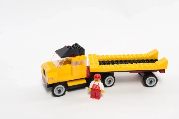 Uzceliet dzeltenu darba transportlīdzekli ar strēli un celtnieka figūriņu – ideāli ainiņām no būvlaukuma un iztēles attīstīšanai.