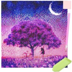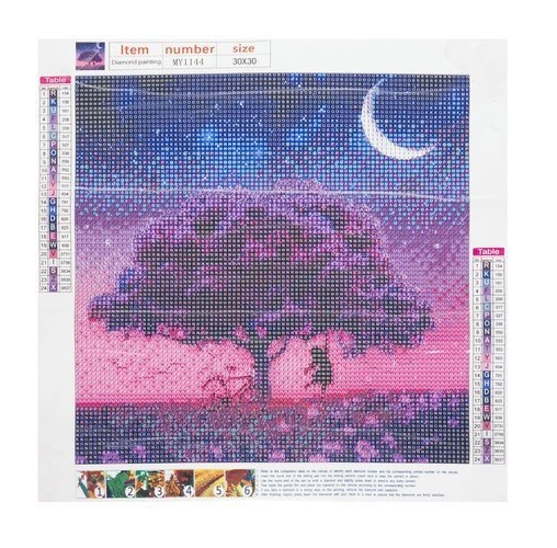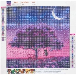 Koka motīvs rozā–violetos toņos ar pusmēnesi rada apburošu mirdzošu efektu, kas izceļas gan rāmī, gan bez tā. Dimanta gleznošana ir ideāli piemērota prāta nomierināšanai, sīko kustību prasmju un kreativitātes attīstīšanai – piemērota gan iesācējiem, gan pieredzējušiem.