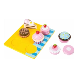 Small Foot saldo kūciņu komplekts iepriecinās visus mazos konditorus un saimniekus. Uz stabilas paplātes bērni pasniedz 6 burvīgus desertus, kurus, pateicoties lipeklim, var atvienot un atkal salikt jaunās kombinācijās. Spēle dabiski attīsta smalko motoriku, radošumu un sociālās prasmes.