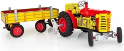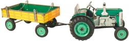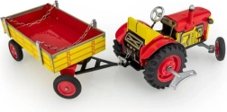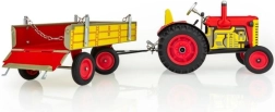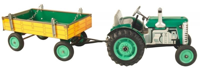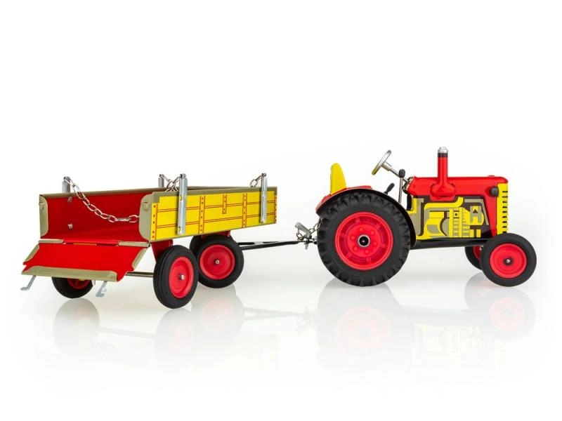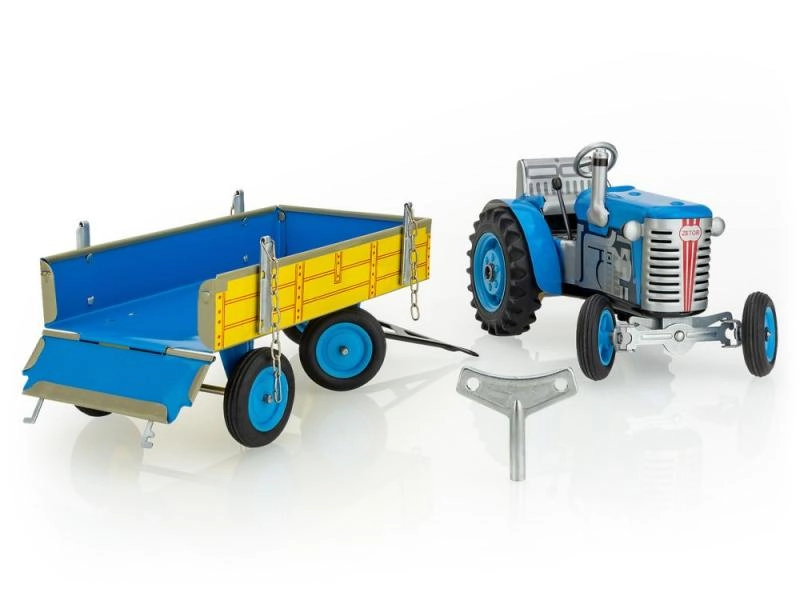 Klasiska skārda rotaļlieta gan maziem, gan lieliem lauksaimniecības tehnikas cienītājiem: Zetor traktors ar noņemamu piekabi ar atsperes mehānismu ar atslēdziņu. Piedāvā 3 ātrumus (uz priekšu, neitrāle, atpakaļgaita), darbojošos stūrēšanu ar stūri un rokas bremzi. Precīzs čehu amatnieciskais izpildījums, sertifikāts “Droša rotaļlieta” un izturīga konstrukcija no apdrukātas skārda, papildināta ar plastmasas riteņiem.